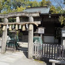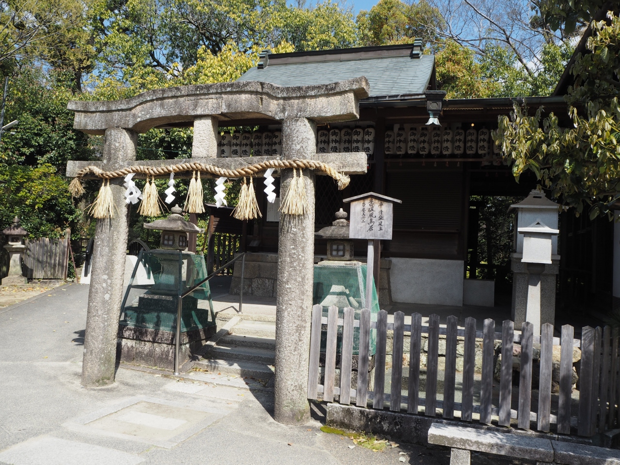 京都御苑内の南側にあり、南側の入り口である堺町御門から入って、すぐ左にあります。かつてはここは九条家の邸宅があった場所で、茶室であった拾翠亭も近くにあり、神社の前には九条池があります。九条家の鎮守として建てられた神社でもあります。九条池などを借景としての神社は絵になります。