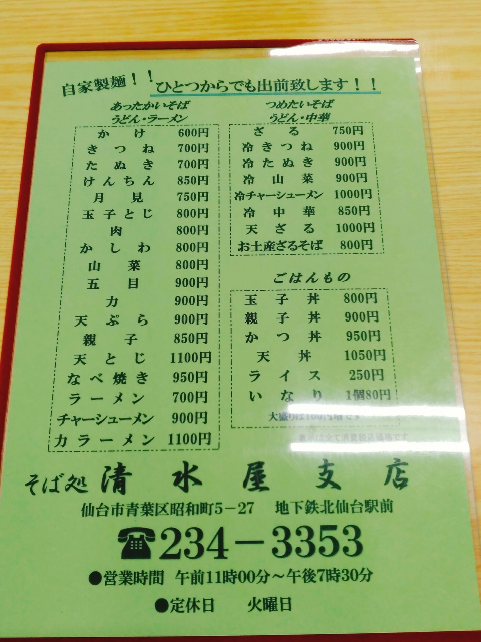 北仙台駅の西側にあります。店内は、テーブル24席です。メニューは、全体的に900円位です。定食の半ちゃん定食はラーメンか、たぬきそば・うどんに半チャーハンではなく半ライスが付きます。もう一つの定食のミニカツ丼セットはミニカツ丼にザル、たぬきそば、ラーメンを選ぶ感じです。今回は、一番人気の半ちゃん定食のラーメン750円にしました。スープは、そば屋ならではの和風出汁です。ご飯にはノリの他に、ふりかけのゆかりをかけることが出来ます。寒いのに新型コロナ対策で換気するので、暖かくなってから行った方が良いかもです。