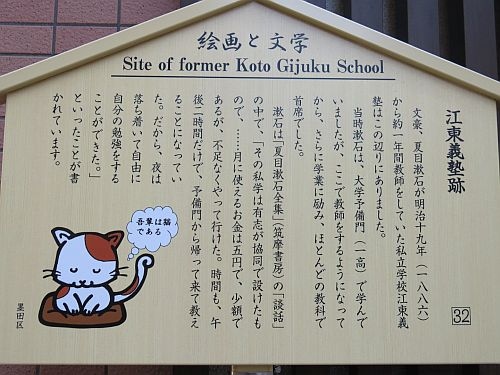 吉良邸跡近くに説明板が立っていました。説明板によると、彼の文豪 夏目祖漱石が第一高等学校の前身の大学予備門に籍を置いていた当時、教師をしていたという私立学校だそうです。学校があったの形跡はなく、現在は「みきや」という飲食店の建物が建っています。少し離れた場所には、芥川龍之介の文学碑や養子先の説明板もあり、この地で二人の文豪が過ごしていたのかと思うと興味深く感じました。