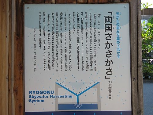 両国国技館の前にある施設です。両国国技館の屋根は雨水を集める機能があり、その水をトイレや冷房に利用していることは知られていますが、こちらの施設も同様の機能があり、集めた雨水を用いて花壇の水やりや打ち水に利用しているとのことです。水資源の保全の重要性が増したこの時代にマッチした施設だと思います。