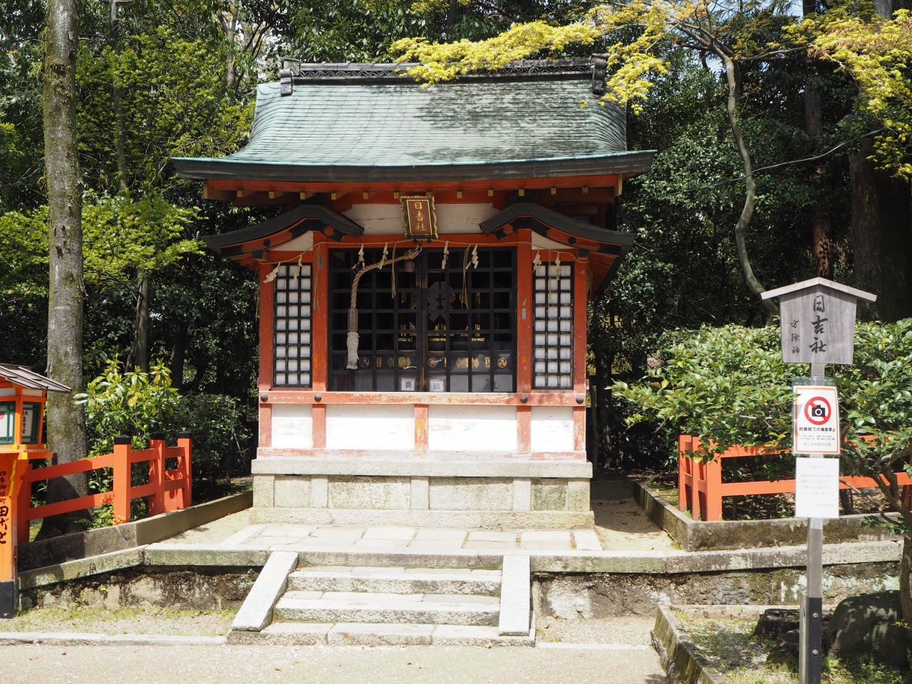 日吉社は八坂神社の境内の中の本殿の裏側、東北の位置にあります。東北というと古来鬼門とされてきた場所で、厄除け、方位除けという意味合いの社です。社は階段のある少し高くなった場所にあり、ほかの社よりやや大きく、あたらしい感じの社です。比叡山延暦寺が京都の東北に建てられたのと同じような意味合いで、そのミニ版ということでしょうか。