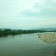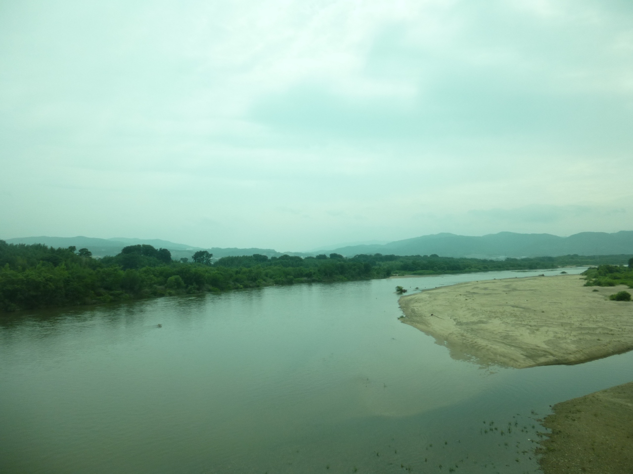 近鉄京都線は丹波橋駅を超えたあたりから、緑豊かな光景の中を進みます。城陽市では木津川と交差します。鉄橋上から東側を見ると、木津川がカーブを描き砂州が出来ています。背後には山もあり、京都の街なかとは全く異なる光景が見られます。木津川は宇治川とは異なり水の流れはゆったりとした感じです。