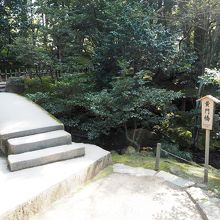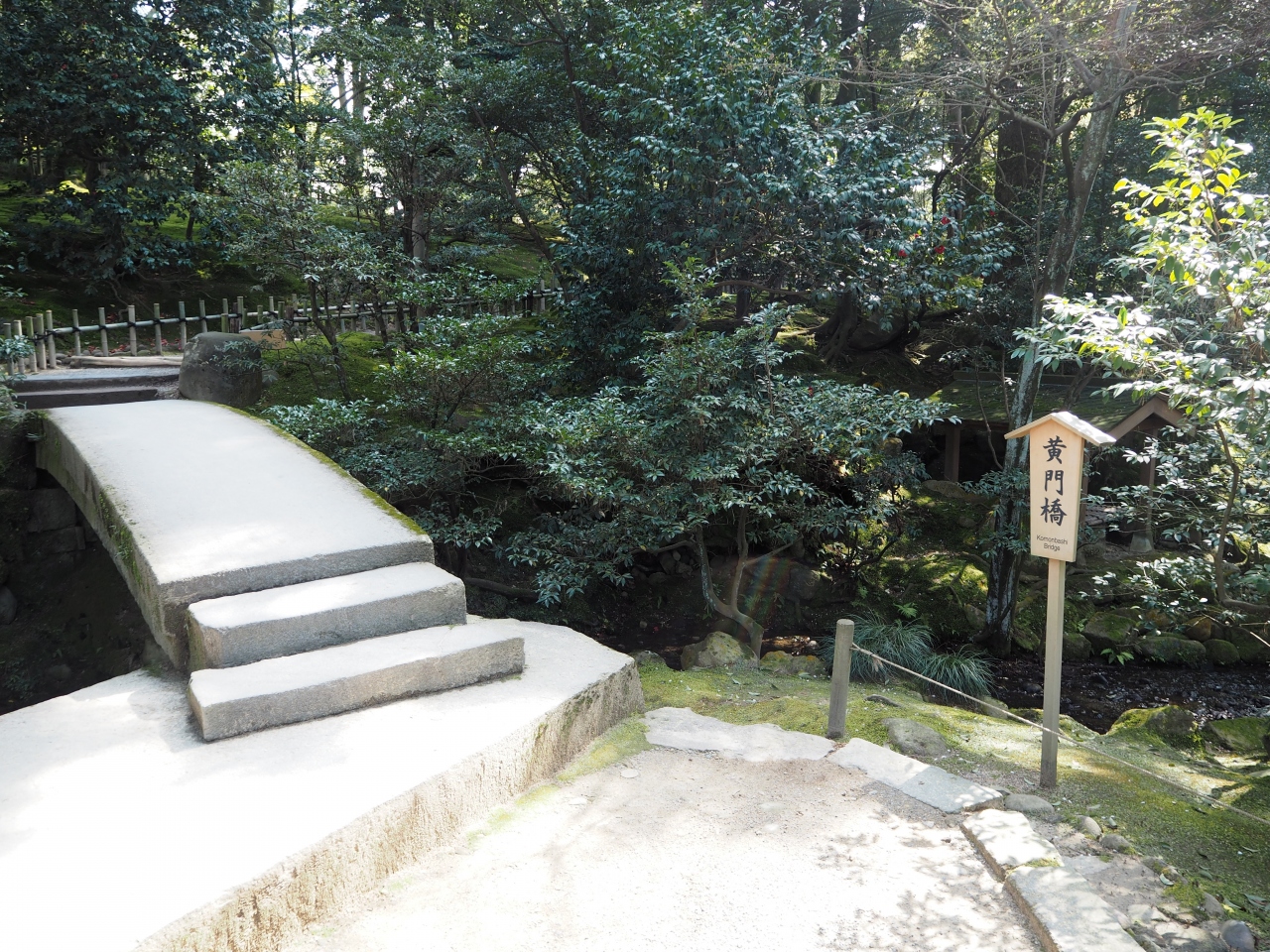 兼六園にいくつかある橋のひとつです。こちらは瓢池から桂坂入り口に戻る途中にありました、木々が多くはえいているエリアにありました。この橋は実際に渡ることができました。それほど特徴的ではなかったですが、看板があったので黄門橋とわかりました。