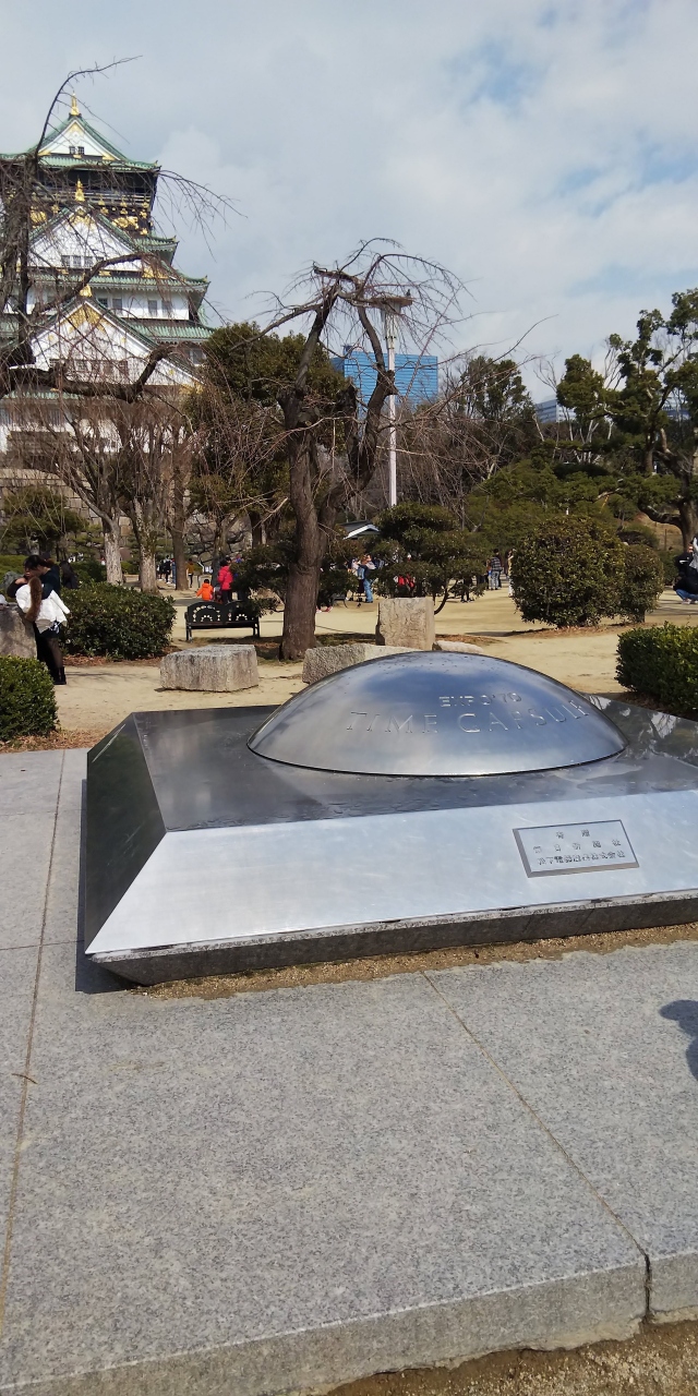 大阪城本丸御殿跡にタイムカプセルはあります。お城なので、他のものは昔ながらのものが多いなかで、明らかに異質な銀色の物体があります。1970年の大阪万博の時に展示されていたものを設置しているようですね。