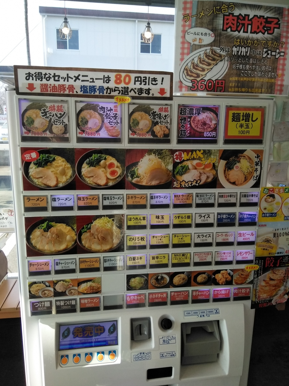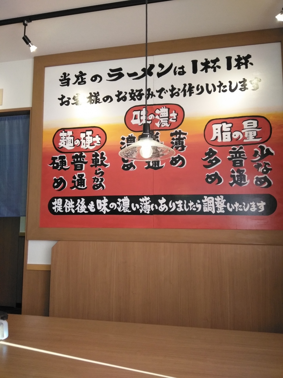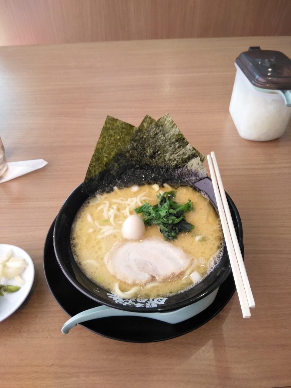 テーブルには「刻み玉ねぎ」と「きゅうりのQちゃん」があり届くまでつまみ食いしました。注文はシンプルな定番ラーメンでした。見た目は濃厚豚骨に見えましたが意外とあっさりでした。注文時に硬さと脂分を指定できますが「普通」にしました。トッピングは各種あります。予め券売機で券を購入します。