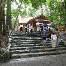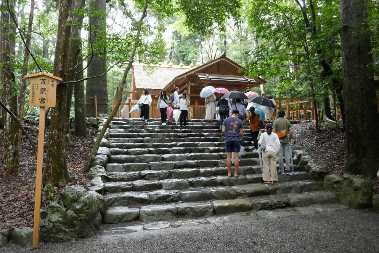 内宮の別宮「荒祭宮」は、天照大神の一面である荒御魂を祀る場所です。内宮で最も格の高い大一別宮であり、内宮内で最もアクセスしにくい場所でしたが、多くの参拝客が訪れていました。石段の先、緑に囲まれて鎮座しており、荘厳な雰囲気が感じられました。
