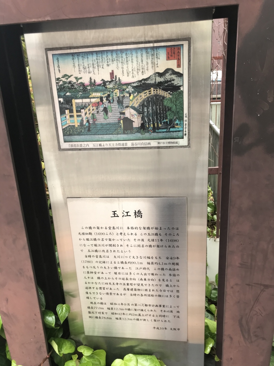 ABCテレビの南側の橋です。昔からあるみたいで、説明書きにある通り、元々は堀江橋という名称だったそうで、近くに堀江川が開削されてそこに堀江橋ができたため、名称を玉江橋に変えたみたい。当時はここから四天王寺の五重塔が見えたとは考えられません。