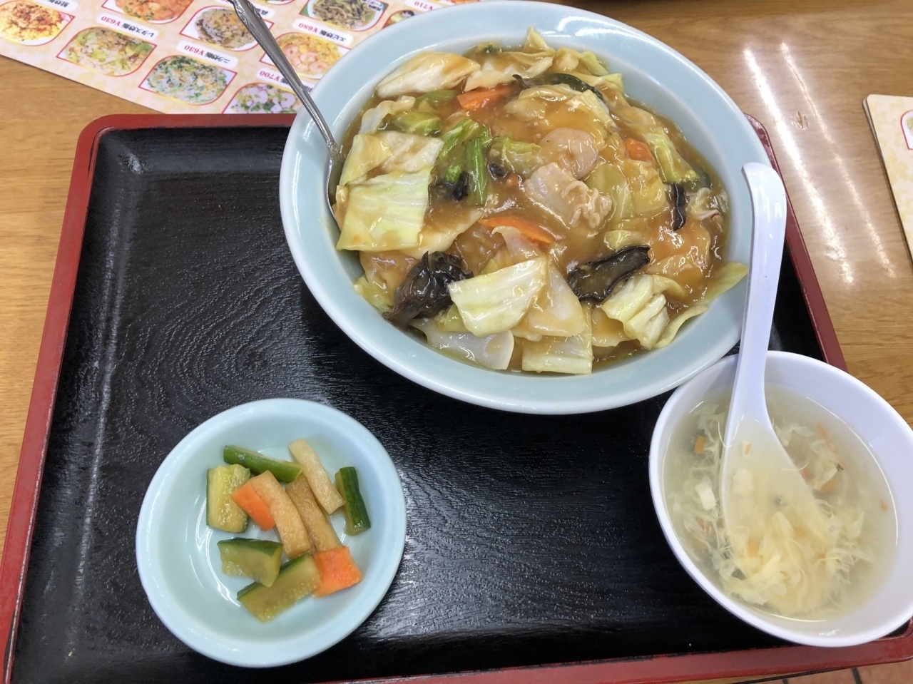 曙橋商店街中間部にある店。明るいオレンジ色の看板に、長崎ちゃんぽんの文字。店内にはカウンター席と確か2つのテーブル席がある。私は中華丼を注文した。630円で中華スープと漬物がセットで出てくる。普通サイズでも結構ボリューミーでコスパが良かった。味も美味しく中国系の調理師さんも親切な方だった。