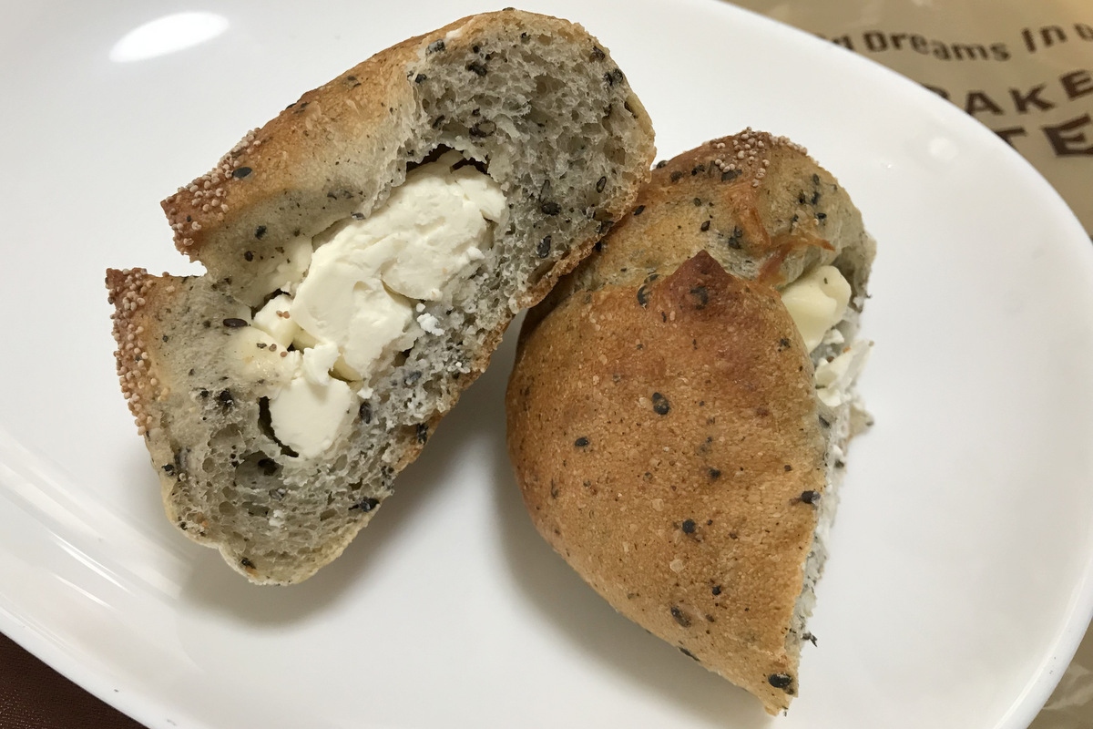 ・ゴマとチーズのパン:クリームチーズをゴマ入りのハードパンで包んだもの