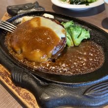 ハンバーグを真ん中からカットすると、中からチーズが洪水のように溢れ出す。