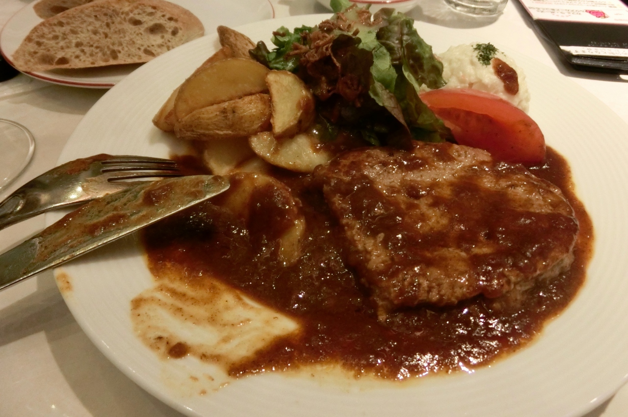 夕食時だが、ガラガラ。ハンバーグ(1300円)はごく普通の味。