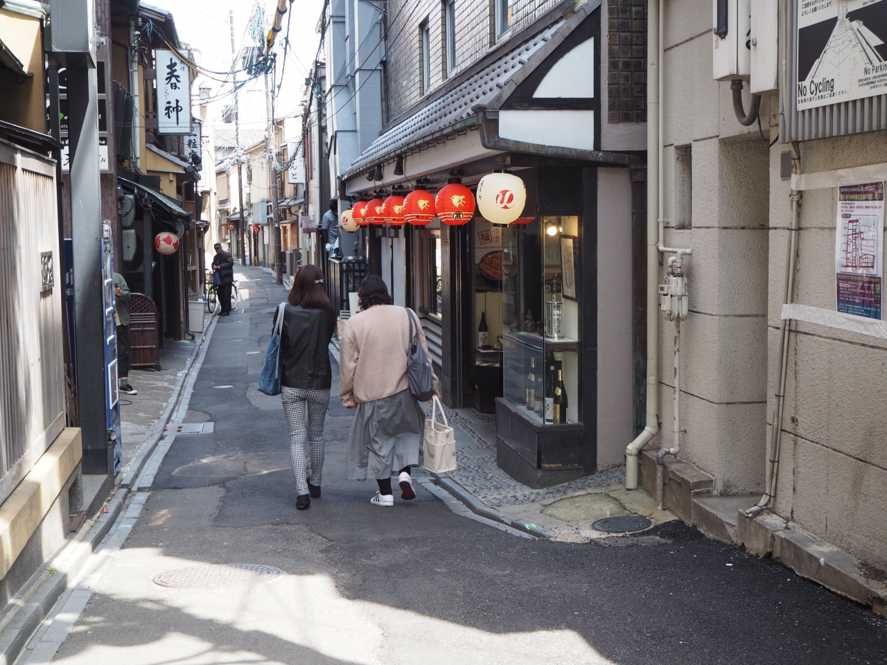 先斗町は鴨川に沿って南北に四条から三条へと続く飲食店街です。車が1台ほどが通れる狭い道に飲食店街が並んでいます。多くは夕方から夜に店は開きますが、昼間に食事がとれる店もあります。先斗町は多くの店は2階建ての木造の家屋の店で、それがずっと続いているのが風情があります。やはり繁華街によくあるネオンがなかったり、風俗の店がないのは先斗町の気品を挙げている感じがします。