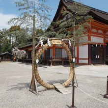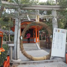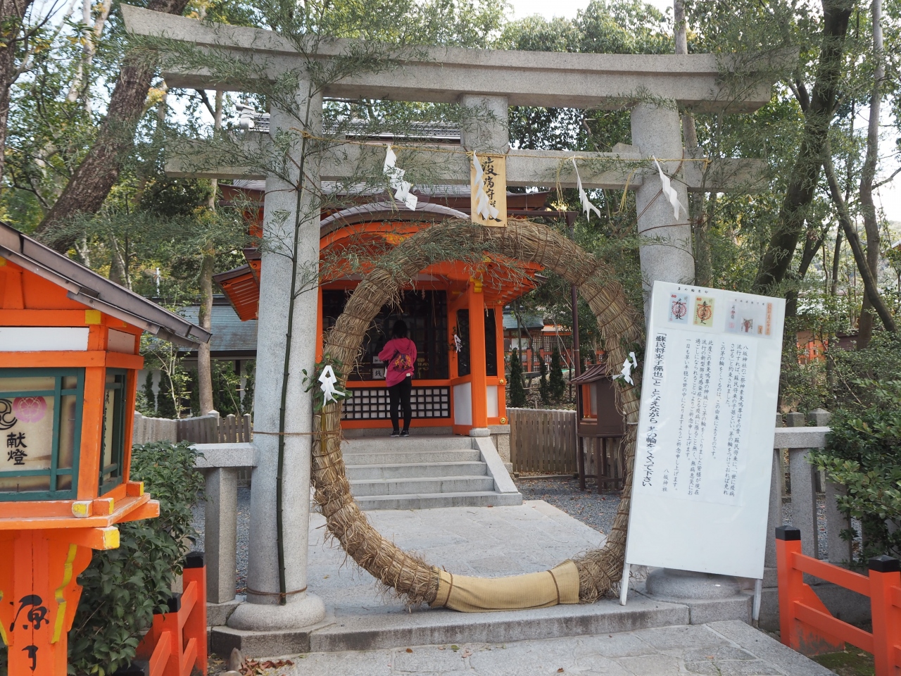 八坂神社の西楼門から境内に入りすぐにあるのが疫神社です。疫神社は疫病から逃れる神社として知られ、須佐之男命が旅の途中に援助を受けた人に茅輪を渡したところ、その家族は病気にならずに過ごせたということからくる話です。鳥居の場所にある茅輪をくぐり疫病をよけてください。疫病除けで、より利用しやすいように本殿の横の境内に大きな茅輪があります。輪をくぐっている人が多くいました。
