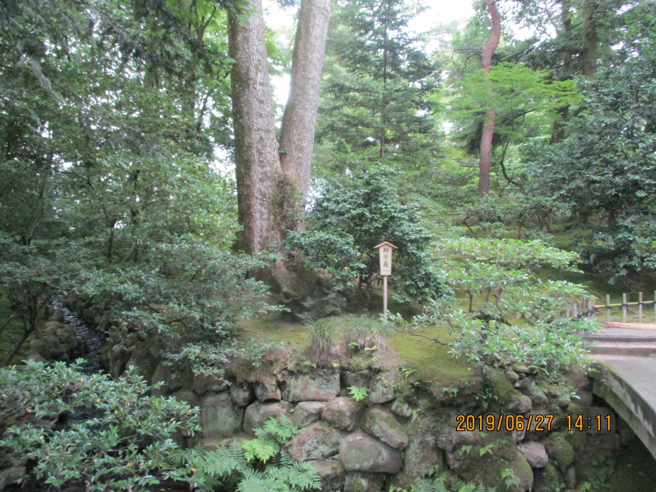 兼六園霞ヶ池の南西、黄門橋の近くにあります。兼六園の虎石、龍石とともに兼六園三名石のひとつに数えられているそうです。獅子巌と書かれた立て札がありますが、木々の中に埋もれるようにあるので、目立ちにくく、見過ごしてしまうかもしれません。