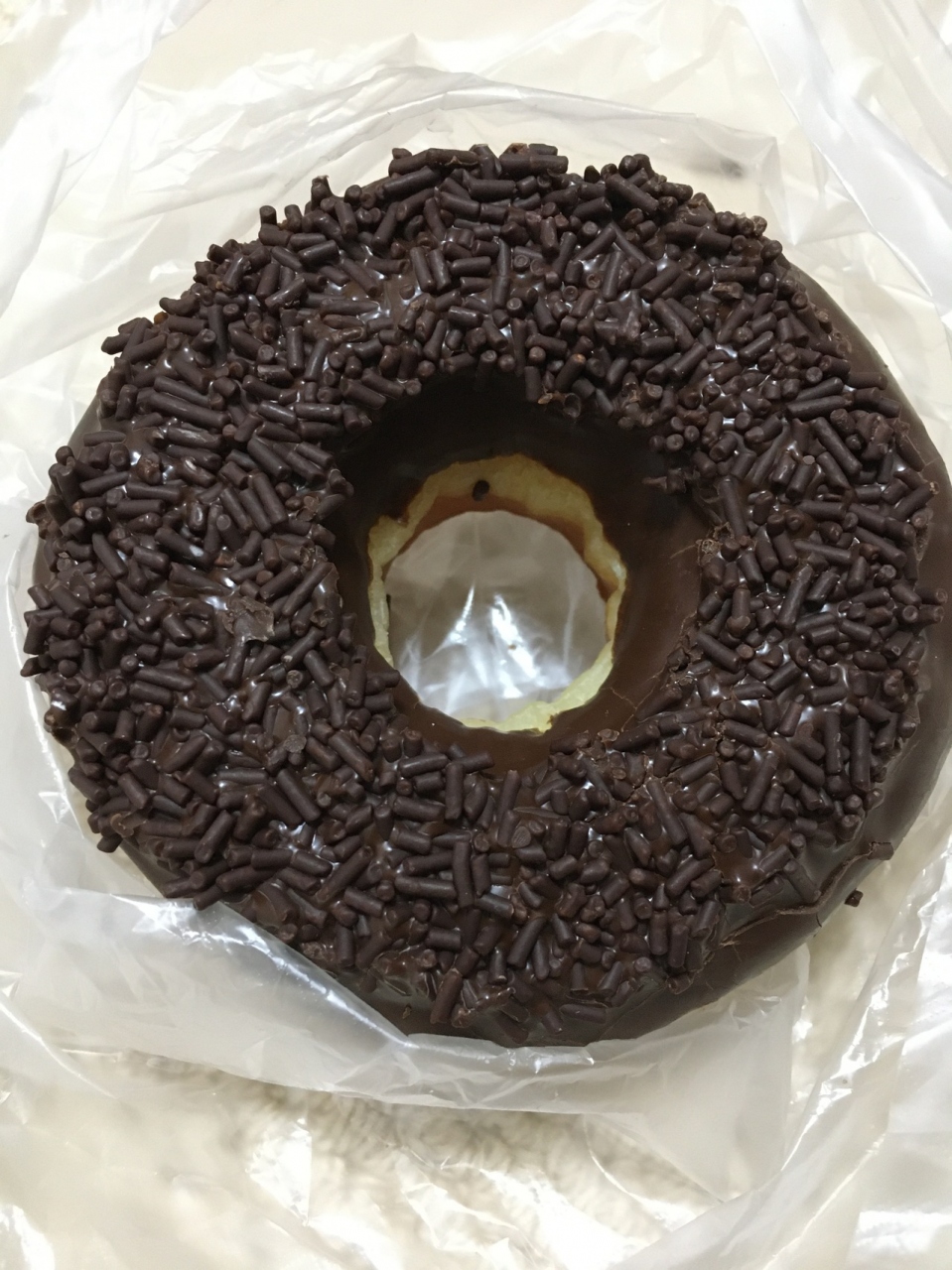 ドーナツ型のドーナツの上には、チョコレートがかかっていて、チョコスプレーが乗っていました。