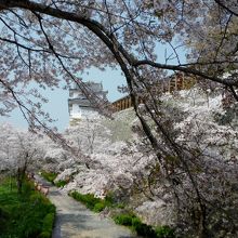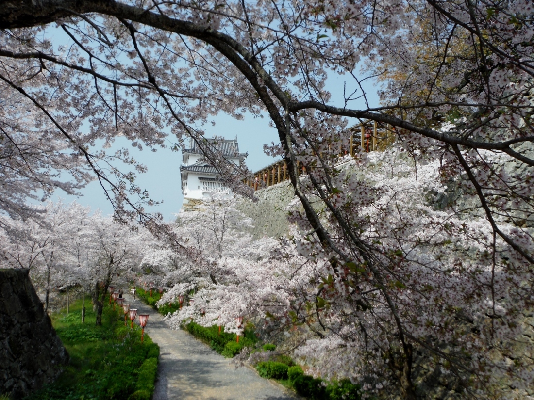桜の名所になっている鶴山公園。桜の時期には雪洞がならびます。少し離れた場所からでも石垣と桜がよく見え桜の多さに驚きました。石垣と桜が綺麗で写真スポットがいくつもありました。白い桜や芝桜などもあってとても美しかったです。紅葉の小径もあり秋の紅葉も楽しめる場所です。
