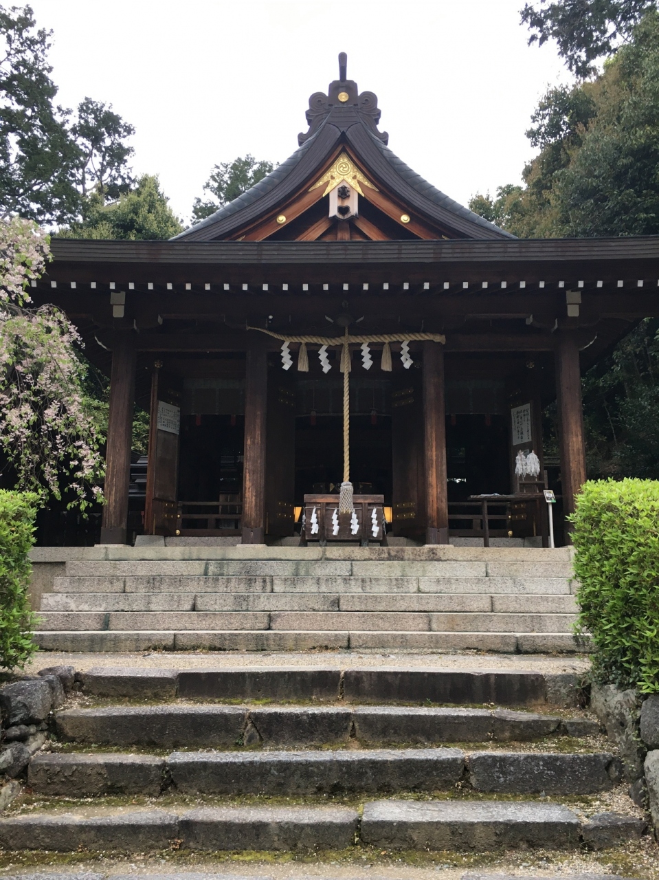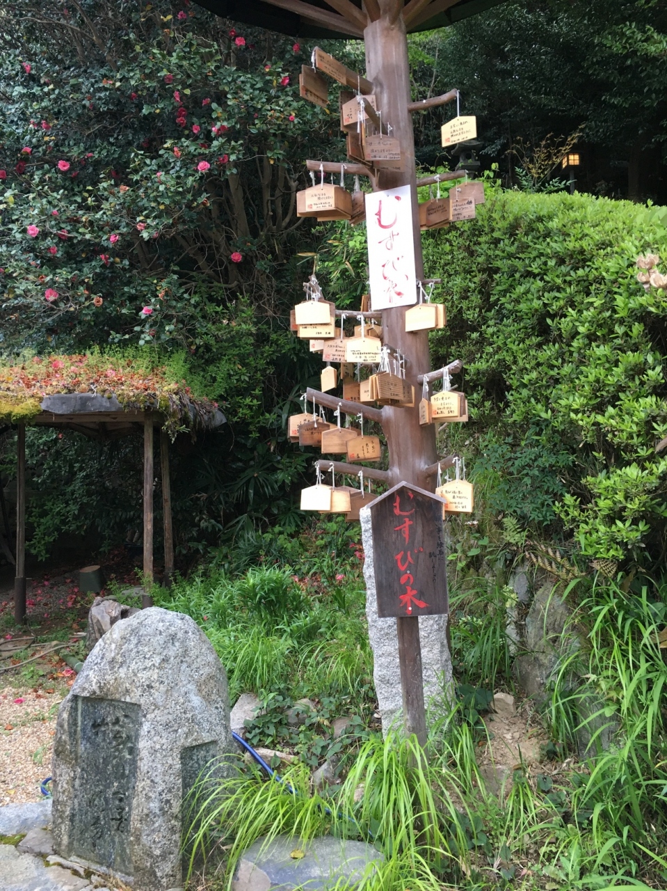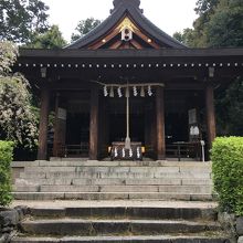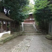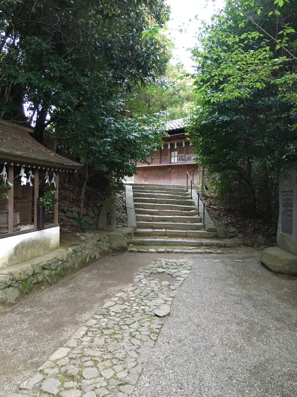 鳥居を潜ると左側が社務所になっていて、むすびの木があり絵馬がたくさんかけられていました。階段を上がって境内です。木々に囲まれているので少し鬱蒼とした感じでしたが社殿は開放的で、能舞台のような建物もありました。