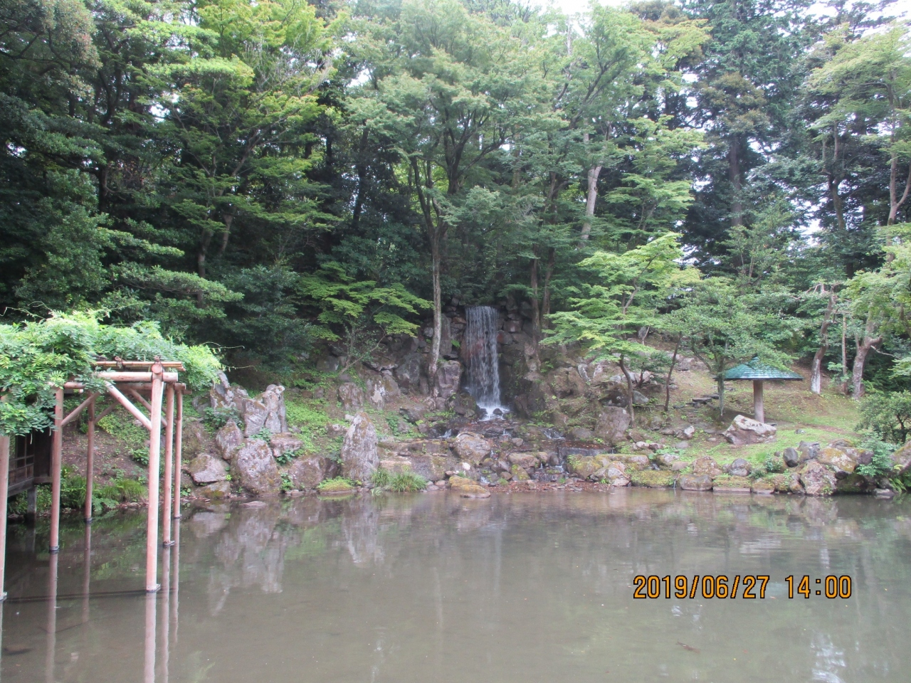 兼六園内の南にある瓢池には、大きな滝があります。この滝は、霞ヶ池の水が瓢池に流れ落ちるもので、庭園内に造られた滝としては、かなり大きなものと言ってよいと思います。この滝は、水量が豊富で滝音も大きいといわれているのですが、今回は、それほどでもなかったのが残念です。