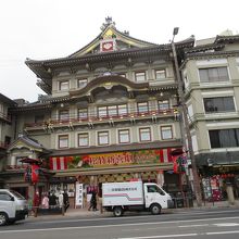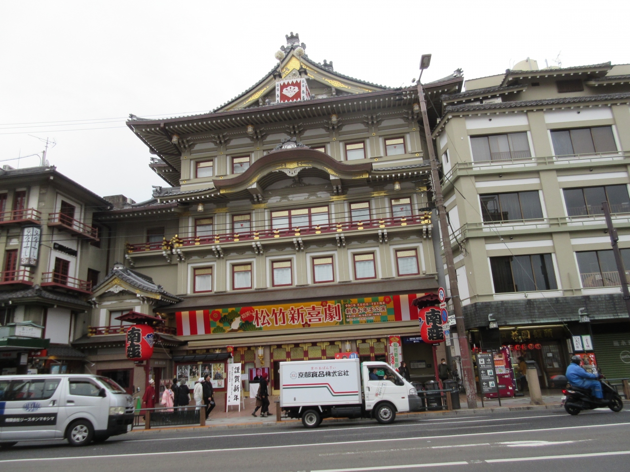 京都鴨川・四条大橋の東側のたもとに京都四条・南座の建物があります。阿国歌舞伎の発祥の地であります。道路を渡った反対側には阿国歌舞伎の像がおかれています。お正月でした、新しく改装されて華麗な外観になっていました。