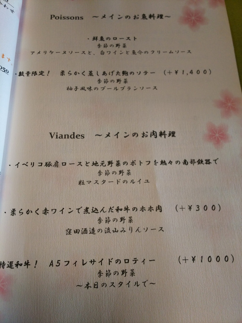 コースが数種類あり、お魚料理とお肉料理も数種類から選択することができます。