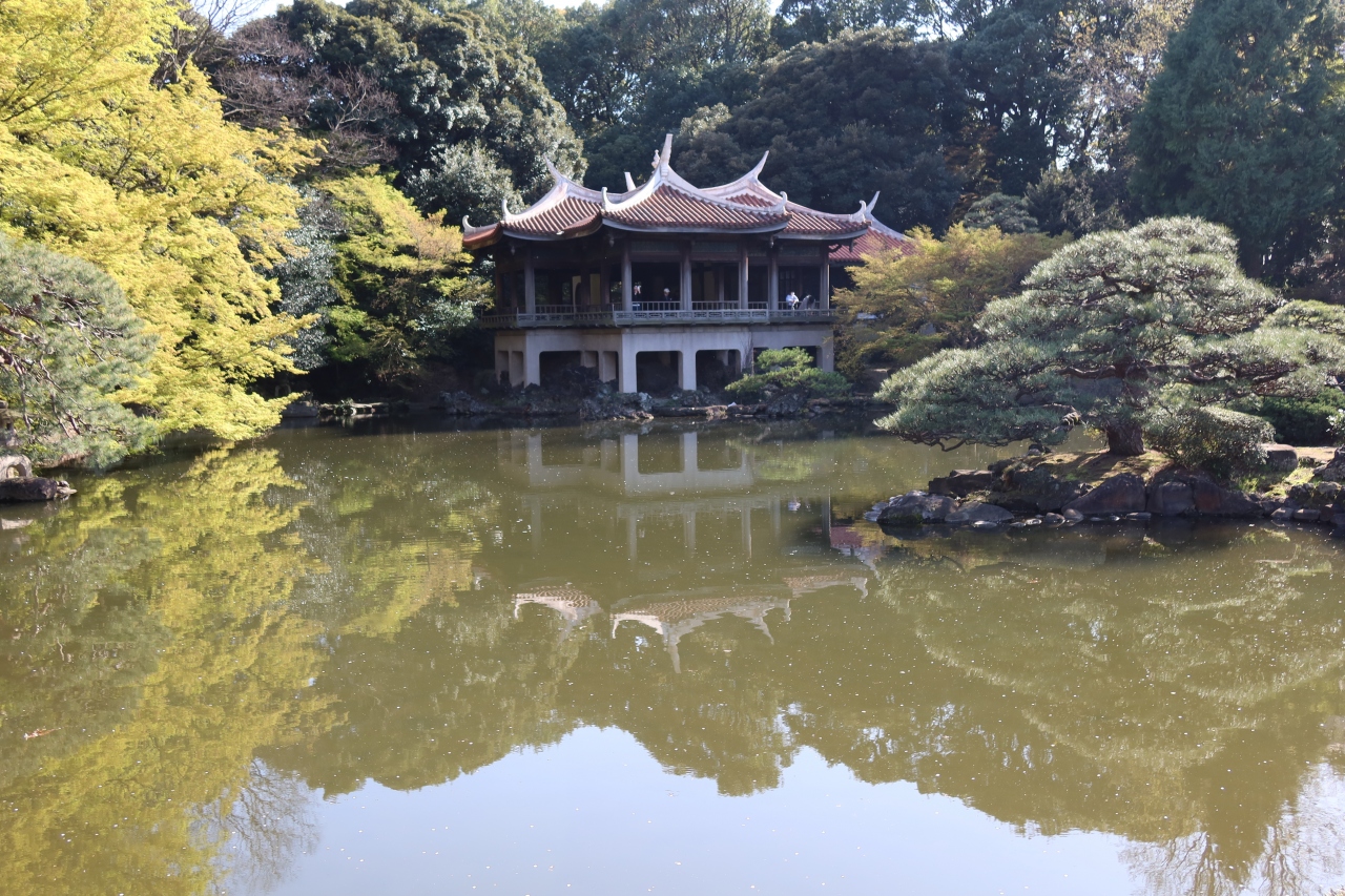 新宿御苑のほぼ中央にある中央レストランから南西に100m程行った池の前に旧御涼亭があります。昭和2年に昭和天皇御成婚を記念して、台湾在住邦人の人々から寄贈された建物で台湾閣とも呼ばれています。本格的な中国南方地方の様式で建てられた建築物で、台湾の龍山寺で見た建物とも似ていました。