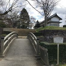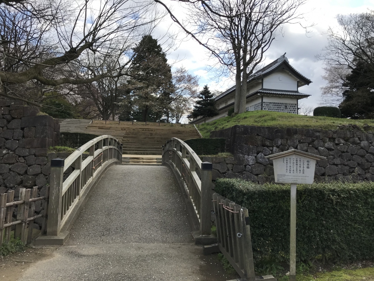 金沢城公園にある橋です。橋爪門をくぐった先にある二の丸広場があるあたりから、三十間長屋へ向かう途中にある橋です。それほど大きな橋ではありませんが、ちょっとアーチ状になった橋でした。この橋の奥の階段をのぼると三十間長屋でした。