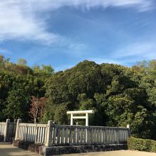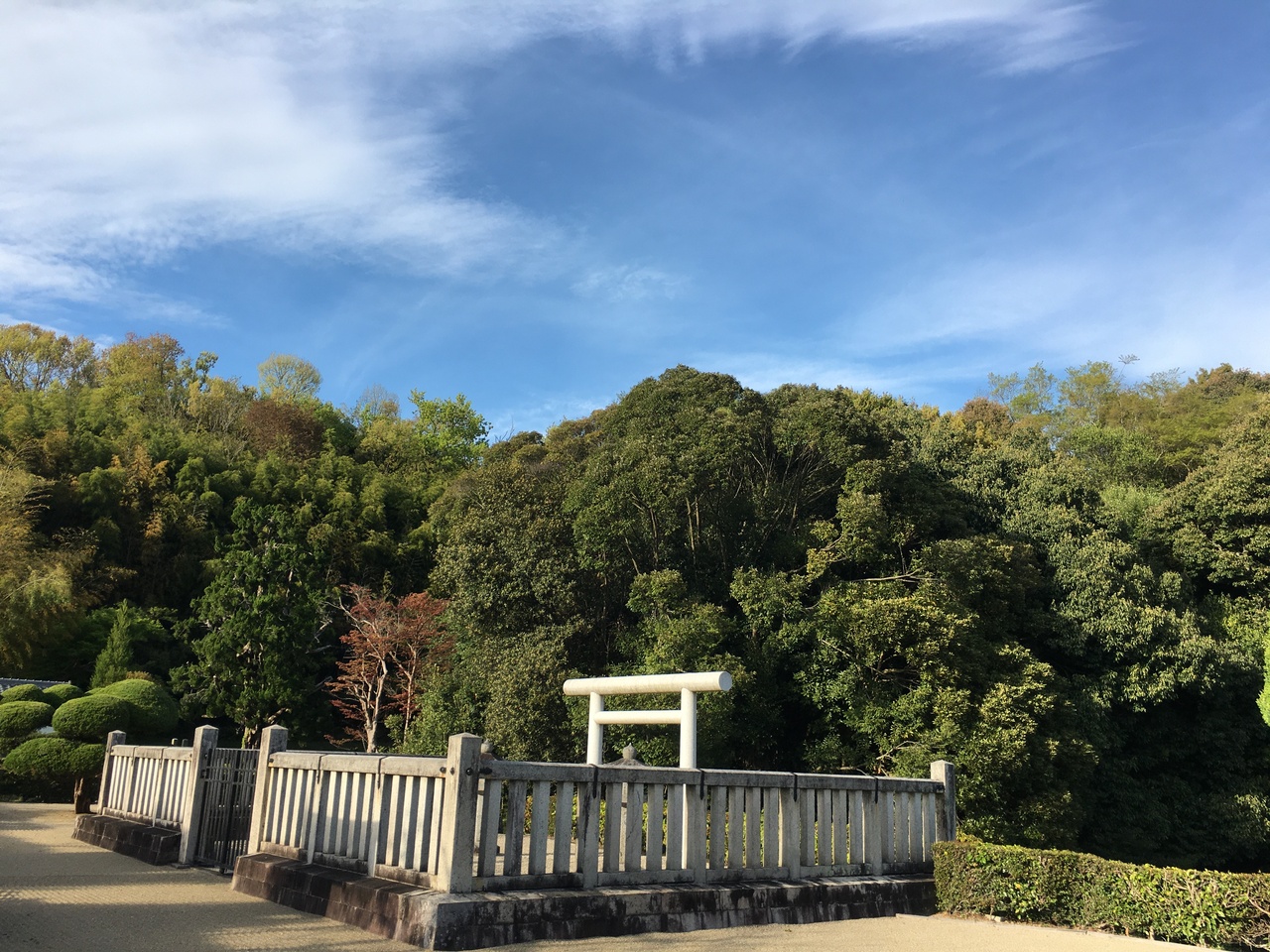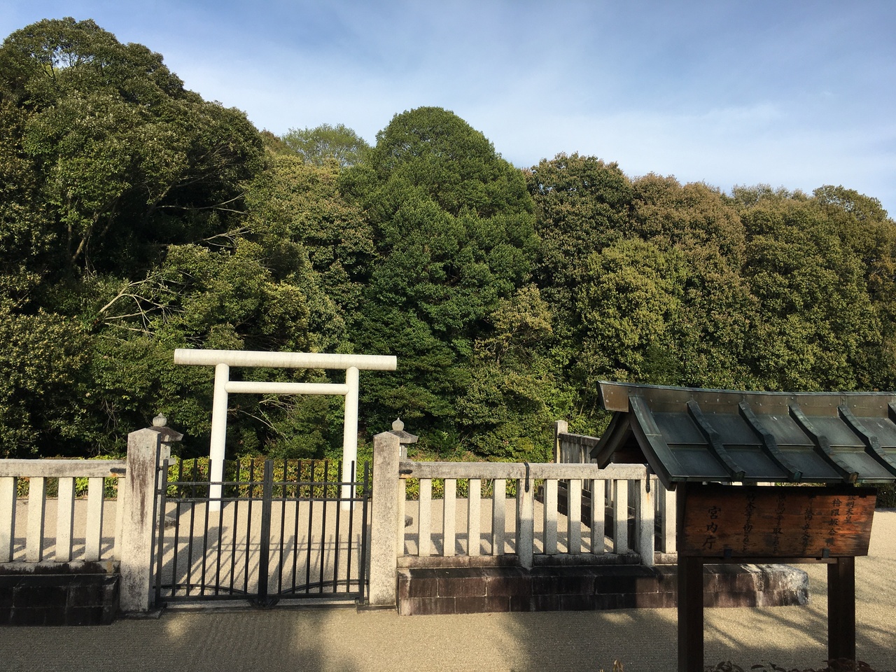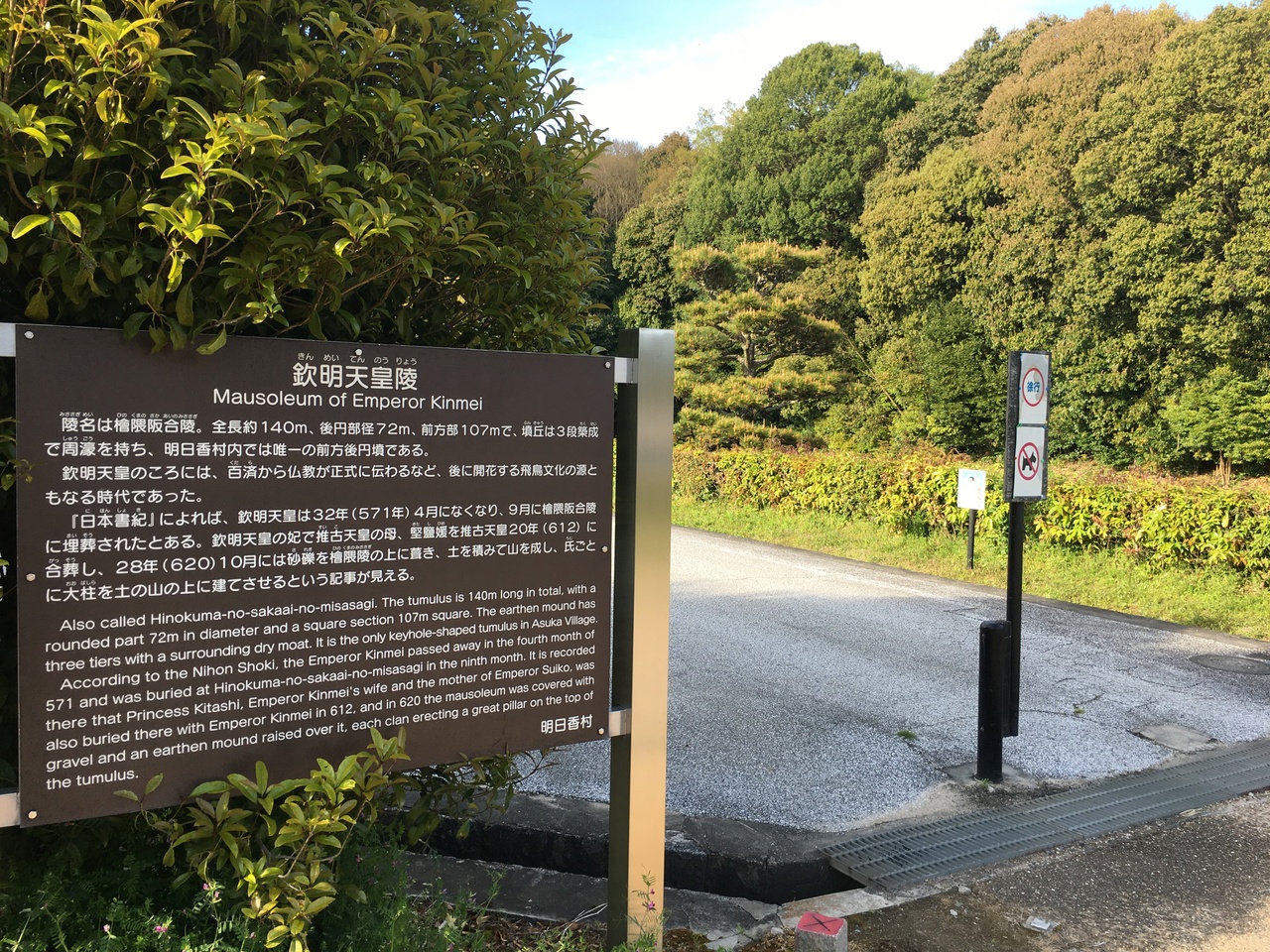 明日香村唯一の前方後円墳で、周りには堀がありました。大きな古墳でしたがよく見ると前方後円墳です。数台止まれる駐車場もあり、囲いに囲まれて、白い鳥居が天皇陵らしく整備されていました。古墳の前には階段もあり、上ると少し高い位置から古墳を見ることが出来ます。