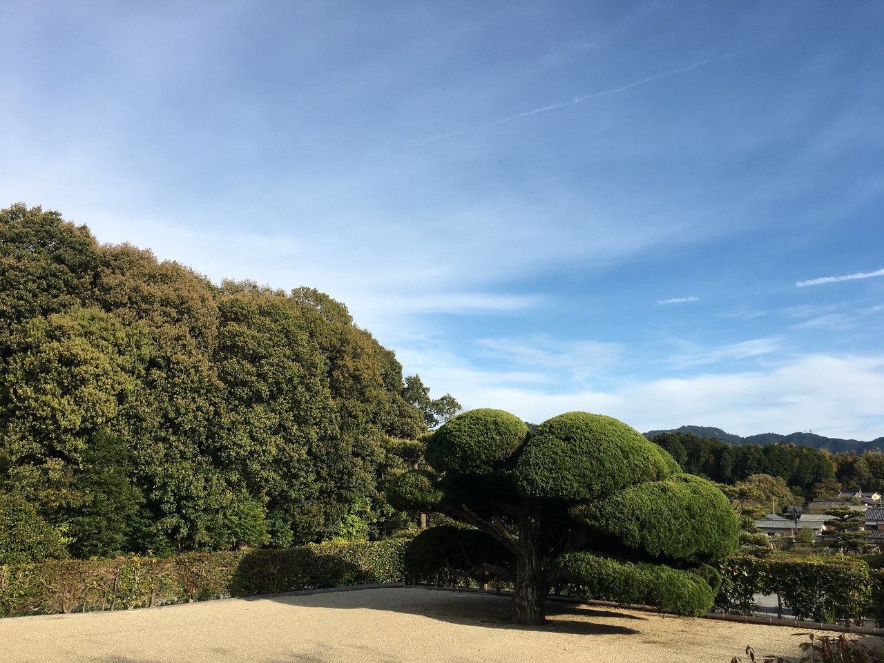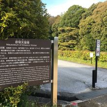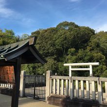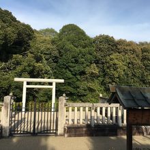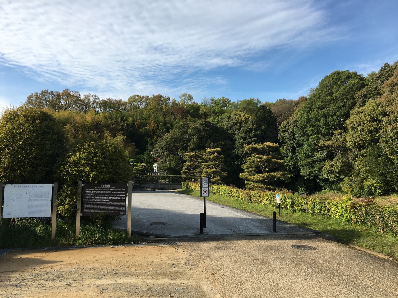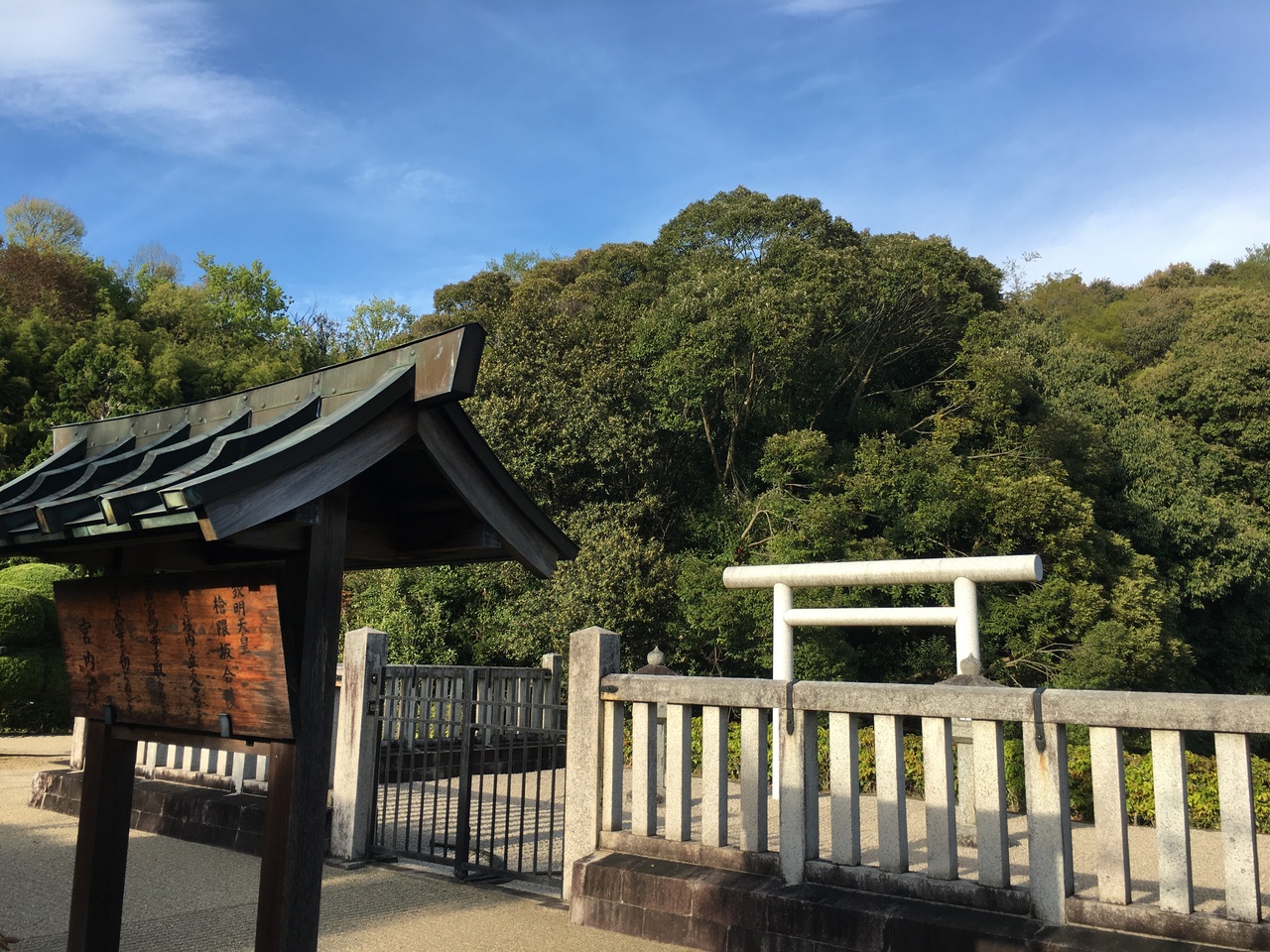 明日香村唯一の前方後円墳で、周りには堀がありました。大きな古墳でしたがよく見ると前方後円墳です。数台止まれる駐車場もあり、囲いに囲まれて、白い鳥居が天皇陵らしく整備されていました。古墳の前には階段もあり、上ると少し高い位置から古墳を見ることが出来ます。
