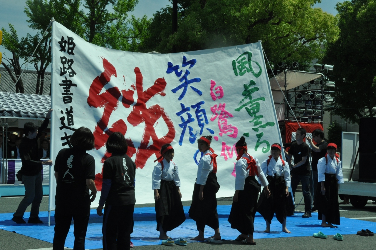JR姫路駅で降りてホテルに荷物を置き、まず向かったのは姫路城。駅前から城に向かって一直線に続く大手前通りでは、沢山の人が集まって何かイベントがあるようだった。新型コロナウィルスの関係で3密厳禁の今では考えられない程沢山の人が集まっていた。イベントは書道パフォーマンスだった。最初は姫路書道キッズという団体が入場し、礼儀正しく挨拶等をした後、パフォーマンスの開始だ。書いている字を見たかったが大混雑で身動きがとれなかったので、撮影も自分の立ち位置からのみ。