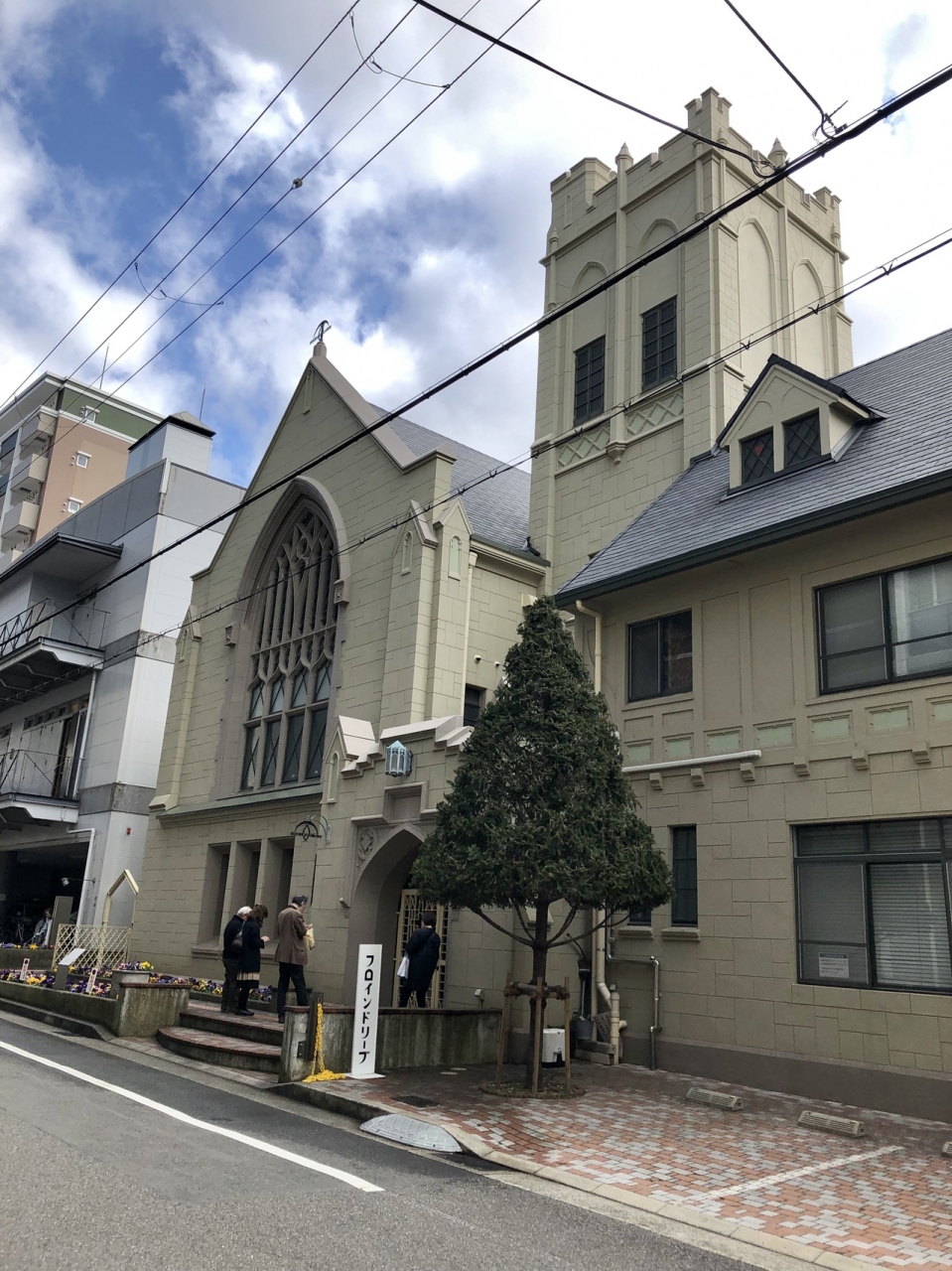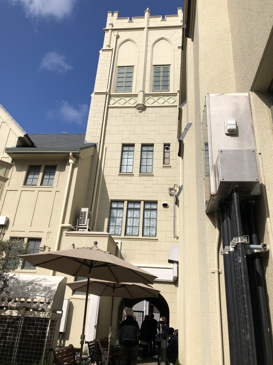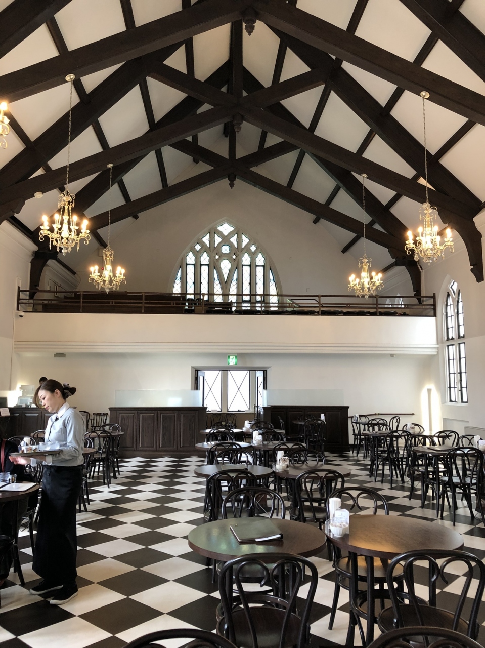 神戸で人気の、教会の礼拝堂を改装して作られたカフェ。開放的な吹き抜けで、ステンドグラス、神聖な雰囲気。登録有形文化財の建物は素敵です!