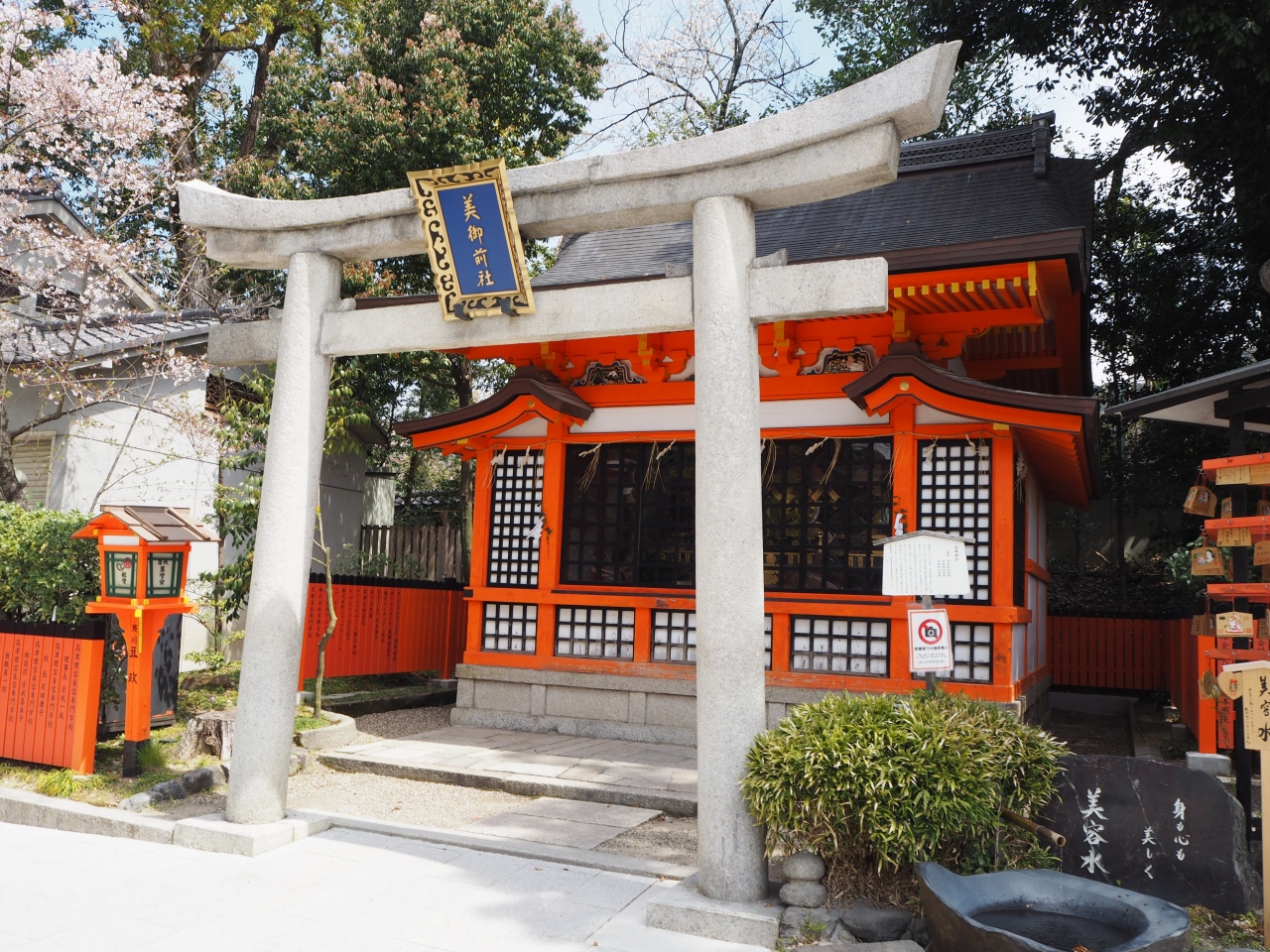 八坂神社の境内の東側にある神社で、神社の鳥居の横には東山からの湧水が湧き出ています。この水は美人の水とされてつけると美しくなるといわれているそうです。近くの祇園などの女性に好まれているというこです。水は湧水なので、豊富なミネラルが含まれているので、そういう効能があるのかもしれません。