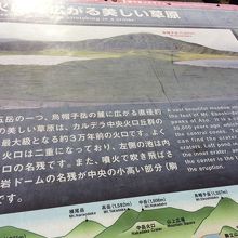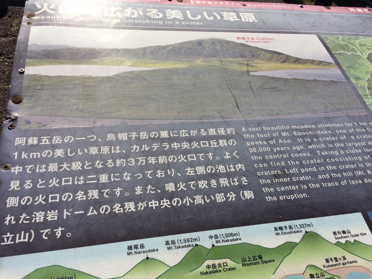 大観峰を見学した後に、レンタカーで下って火山の火口跡だそうです。今は放牧地として使用されているようで、馬が何匹もつながれていました。茶色い芝生が広がっているといったような景色でした。風がふいて気持ちよかったです。