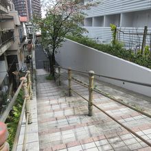 牛込柳町駅から外苑東通りの右側の歩道を南へ歩いていくと急な坂道があります。坂道を上がった先の浄栄寺向かいにある階段坂道です。外苑東通り沿いに江戸時代に薬王寺があったことから名付けられました。途中まで真ん中に手すりがある階段があります。階段の中程にハナミズキが一本あるのが特徴です。訪れた時薄いピンク色の花が咲いていました。大久保通りと女子医大通りに挟まれたこの一帯に寺院が多いので寺巡りをする際に寄ってはいかがでしょうか。