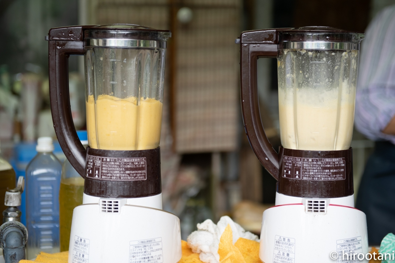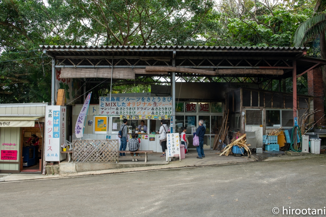 米原のヤエヤマヤシ群落の入り口にあるパーラーぱぱ屋。昔ながらの掘立ごやのような作りの店構え。とれたてのサトウキビが置いてあって、これから生ジュースが生まれます。パイナップルやドラゴンフルーツとサトウキビのミックスジュースはとても美味しい。また、ここにはアイドルの猫も住み着いているようです。