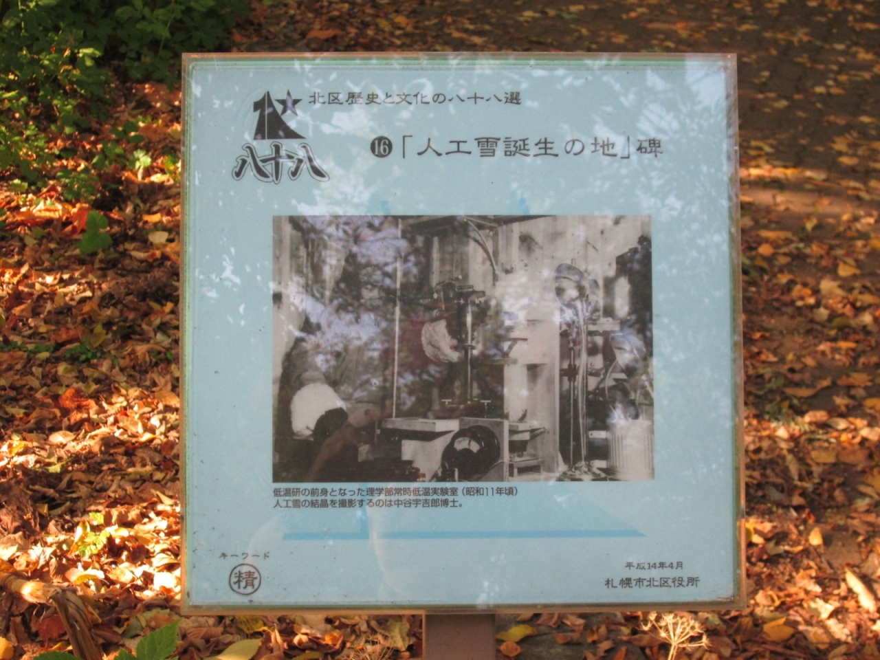近くに人工雪を撮影する中谷博士の写真が展示されていましたが、以前ここに「常時低温研究室」があり、ここで人工雪を初めて造ったことを讃えた記念碑だそうです。