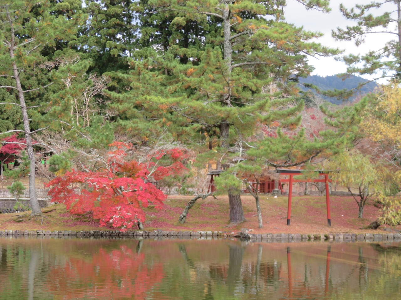 中門の手前にあり天気の良くて風のない日は中門と大仏殿がきれいに水面に写るようです。しかし名前は真ん中にある島が手鏡のような形なので鏡池とついたとか。真ん中の島にはわたることができないようなので形までははっきりわからず。遠くからだとちょうど紅葉がきれいだなあと思いました。