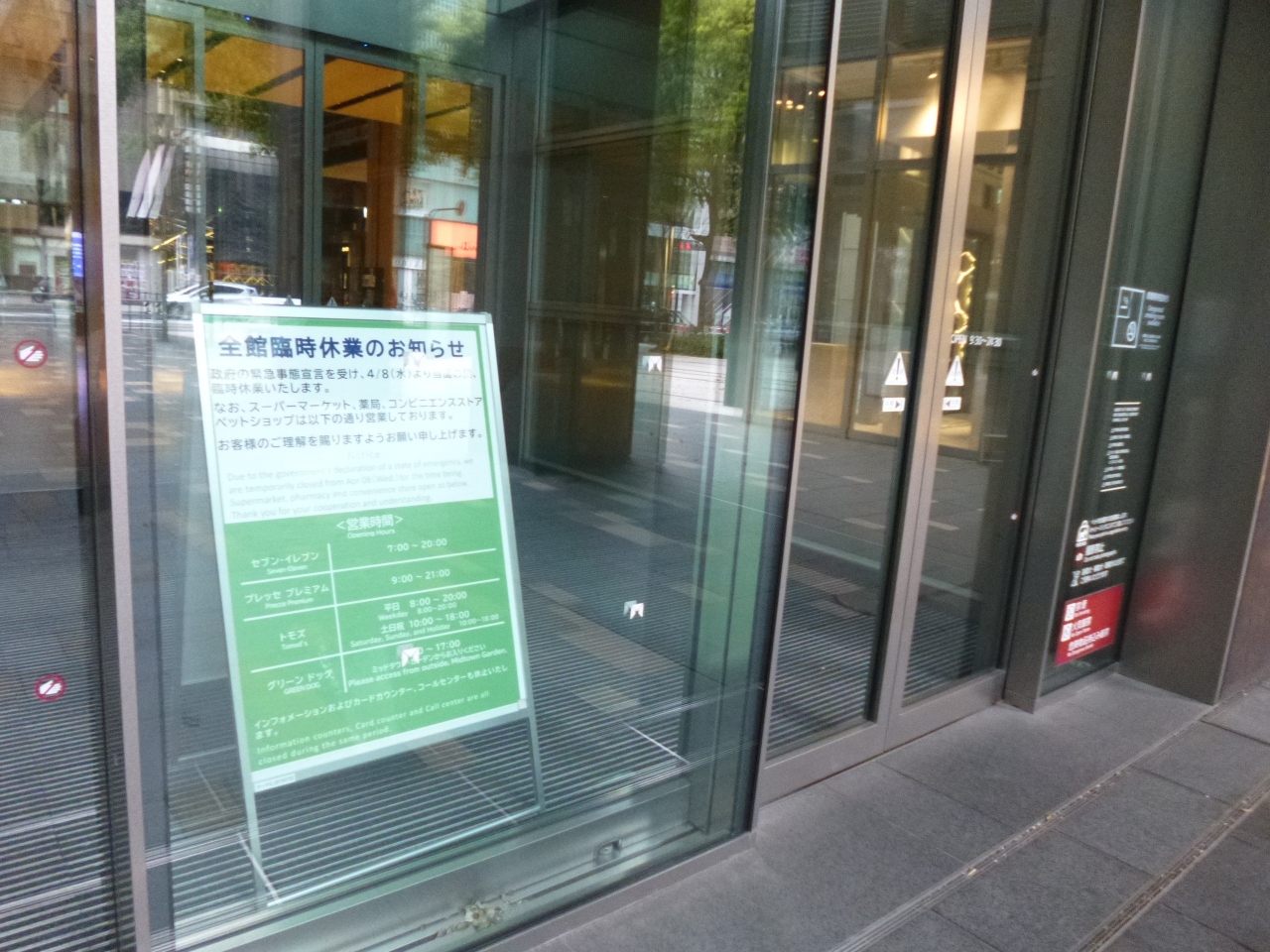 4月初め、ミッドタウンの近くを通りました。全館臨時休業になっていて、人影もまばらでした。オフィスの方もおそらく出勤者が減っているのか、いつもは、ショッピングの人や、サラリーマンの行きかう、建物前のスペース、プラザもほとんど人がいませんでした。