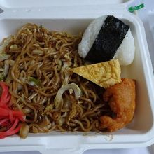 店に入ると中央が鉄板のテーブル席が見えます。綺麗な店内です。テイクアウトで焼きそば弁当を注文しました。焼きそば、オニギリ、からあげ、卵焼きが付いて税込500円なのでお得です。オニギリの具が鮭でした。手作り感があって、コンビニおにぎりより好感が持てました。