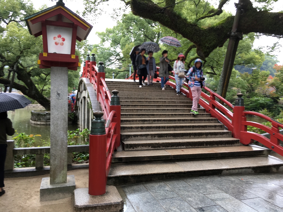 太宰府天満宮の参道の、鳥居から本殿へ続く楼門の間には池があり、その池にはアーチ状の太鼓橋がかかっています。赤く塗られ、丸く弧を描くようにかけられた橋は、境内でも一つのアクセントになっています。アップダウンはありますが、ぜひこの太鼓橋を渡ってお参りをおすすめします。訪問時は雨でしたので、滑りやすくなっていました。雨の日に通行される際はご注意ください。