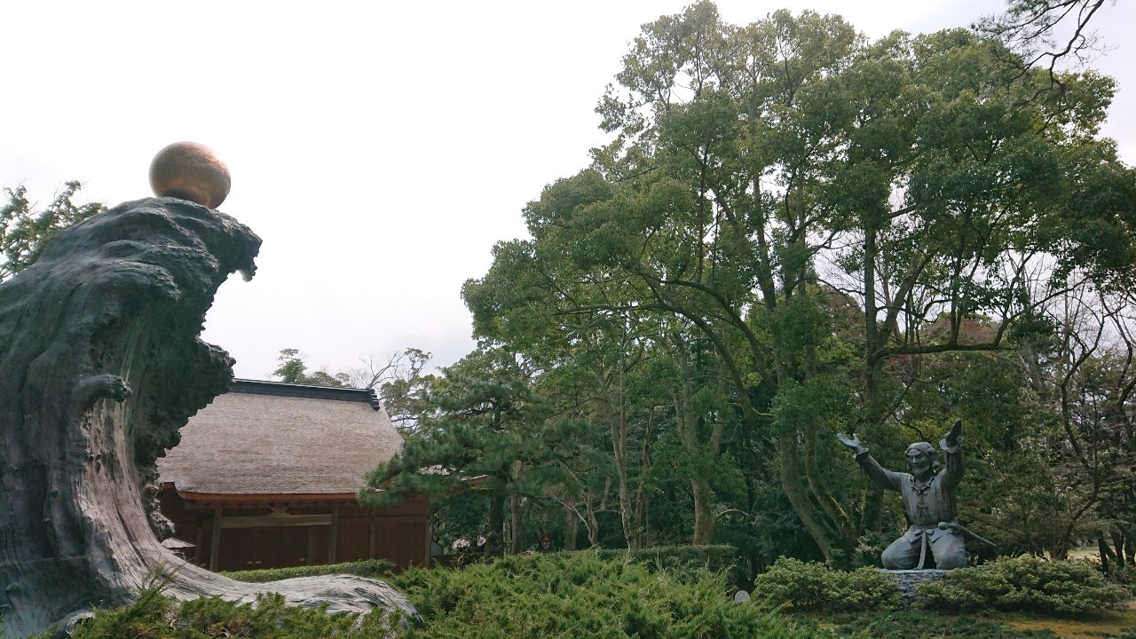 出雲大社の参道に入るとすぐ右手の方にこちらの オブジェがあるのですぐにわかると思いますが美術館の展示品のような綺麗な彫刻ですが神話の世界をモチーフにしているということで解説文を読むならがよく意味が分かりませんでした。神話の世界で大国主が魂を授かったシーンを再現してるということだそうです