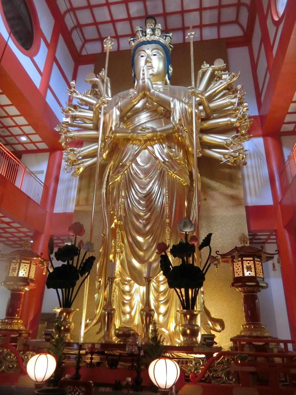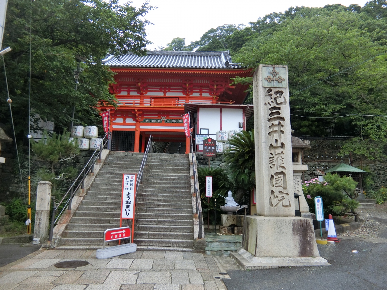 和歌山駅から紀三井寺に行くには、バスか電車になります。和歌山駅に行くと、ちょうどバスが止まっていたので、行きはバスにしました。バス停から少し歩き、楼門を入ると231段の長い階段があり、上るのが大変です。紀三井寺には立派な本堂や朱塗りのきれいな多宝塔などありますが、見応えがあるのは仏殿です。木造の立像仏として日本最大の大千手十一面観世音菩薩が金色に輝き見ごたえがありました。