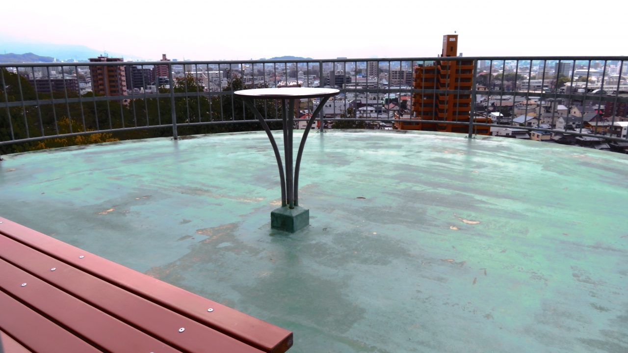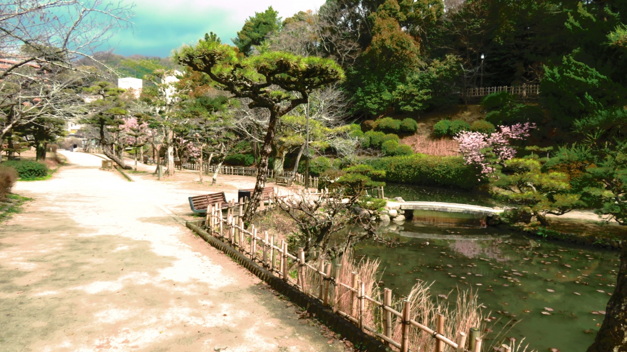 道後温泉から徒歩数分の場所にあり、湯築城跡に整備された公園です。中央部は高さ30mの丘陵地となっていて、展望台からは松山市内が一望でき、松山のシンボルともいえる松山城も展望台から見る事ができます。公園の中心には池があり、池にはカメや魚がたくさん泳いでました。。