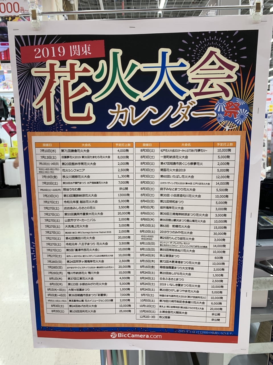 ラゾーナに入っているビックカメラにプリンターのインクを購入しに立ち寄りました。ビックカメラの入り口付近には花火大会カレンダーがありました。都内近郊の花火大会が一覧になっていてわかりやすくありがたかったです。