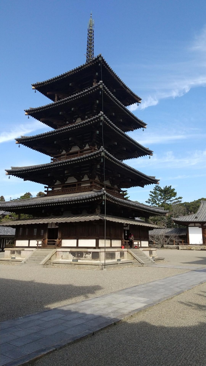 法隆寺にある五重塔です。仏教における塔は仏舎利というお釈迦様の遺骨を納めるために作られています。均整がとれた美しい塔です。様々な角度から、しばらく見とれました。周りは囲まれておらず、中に入ることもできます。