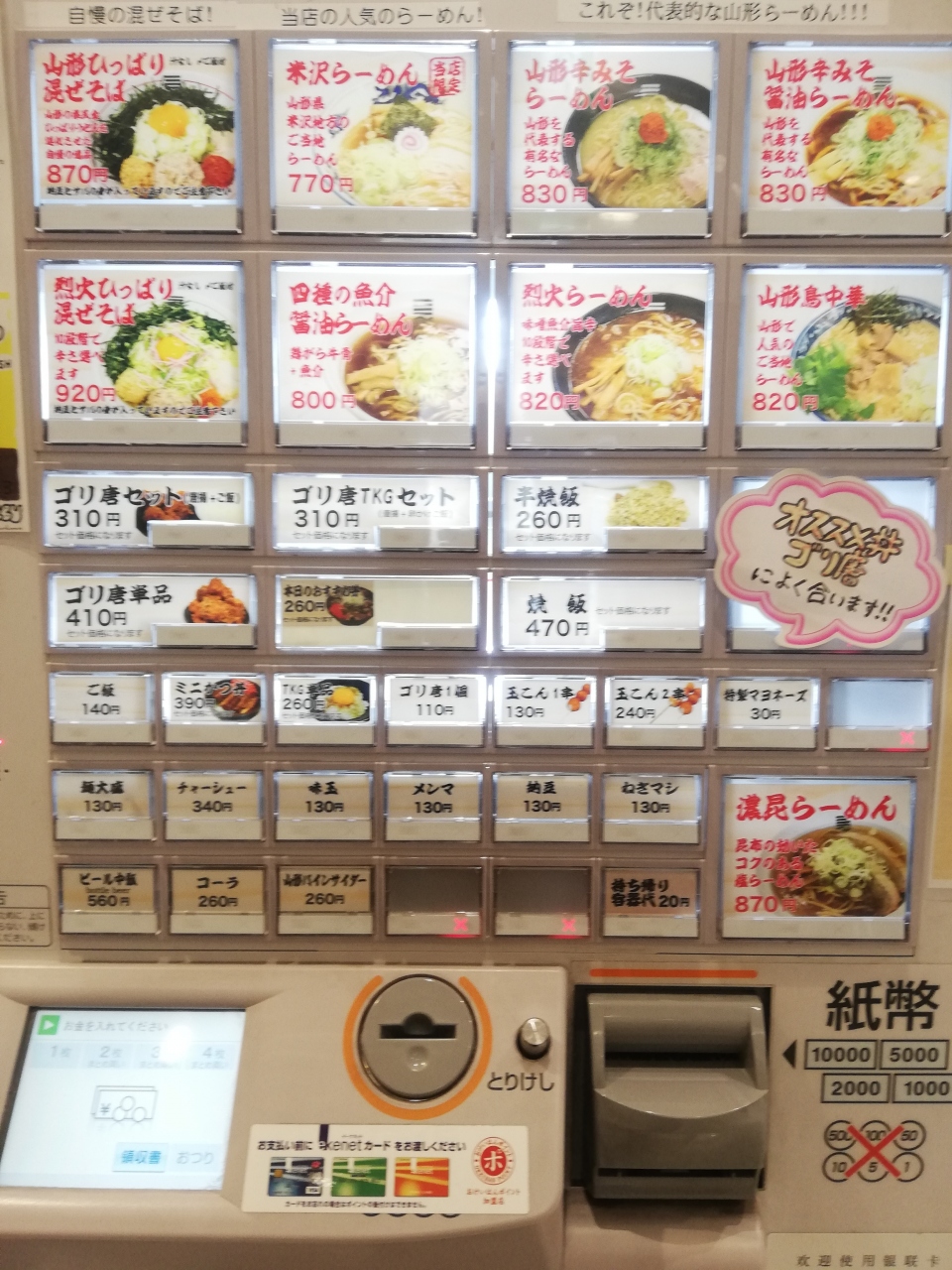 一番カロリーの低そうな米沢ラーメン(770円税込)+半炒飯(260円)を頂きました。あっさりなのに味がしっかりしていて、麺もモチモチで美味しかったです♪食券機で購入してから、席に着くタイプのお店です。店員さんも元気が良くて、気持ち良かったです。