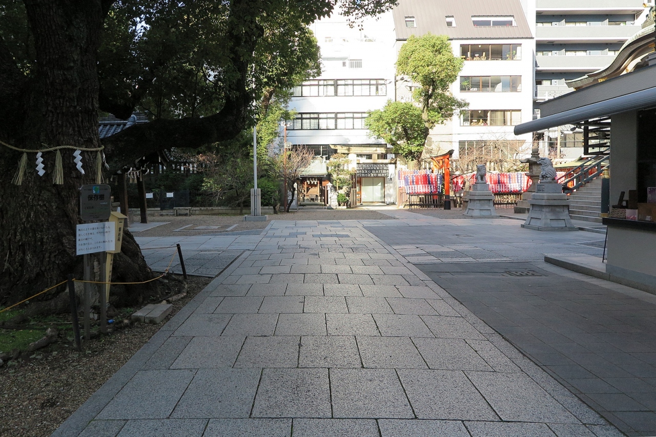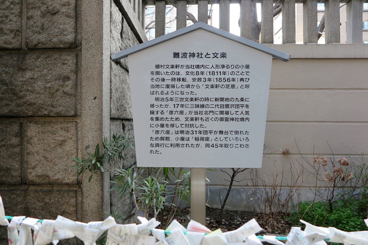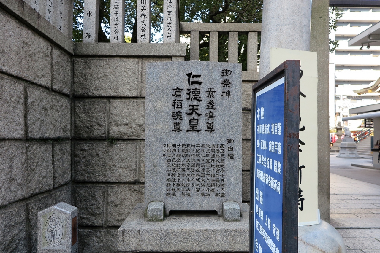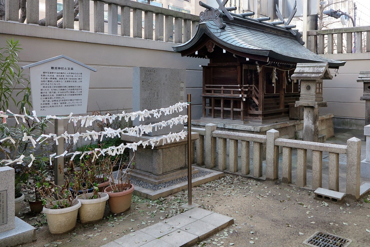 反正天皇が父親の仁徳天皇を御祭神として創建したという由緒正しい神社です。ただし、さすが船場、境内にある「博労稲荷神社」が商売繁盛の神様として船場の商人から篤い信仰を受けているようです。また文楽とも深い関りを示す碑もありました。