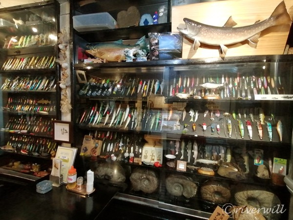 オーナーの趣味で釣り関係・アンモナイトの化石なんかが置いてあり