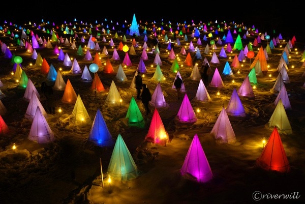 屋外に規則正しく並べられた三角テントにカラフルな光が灯され、