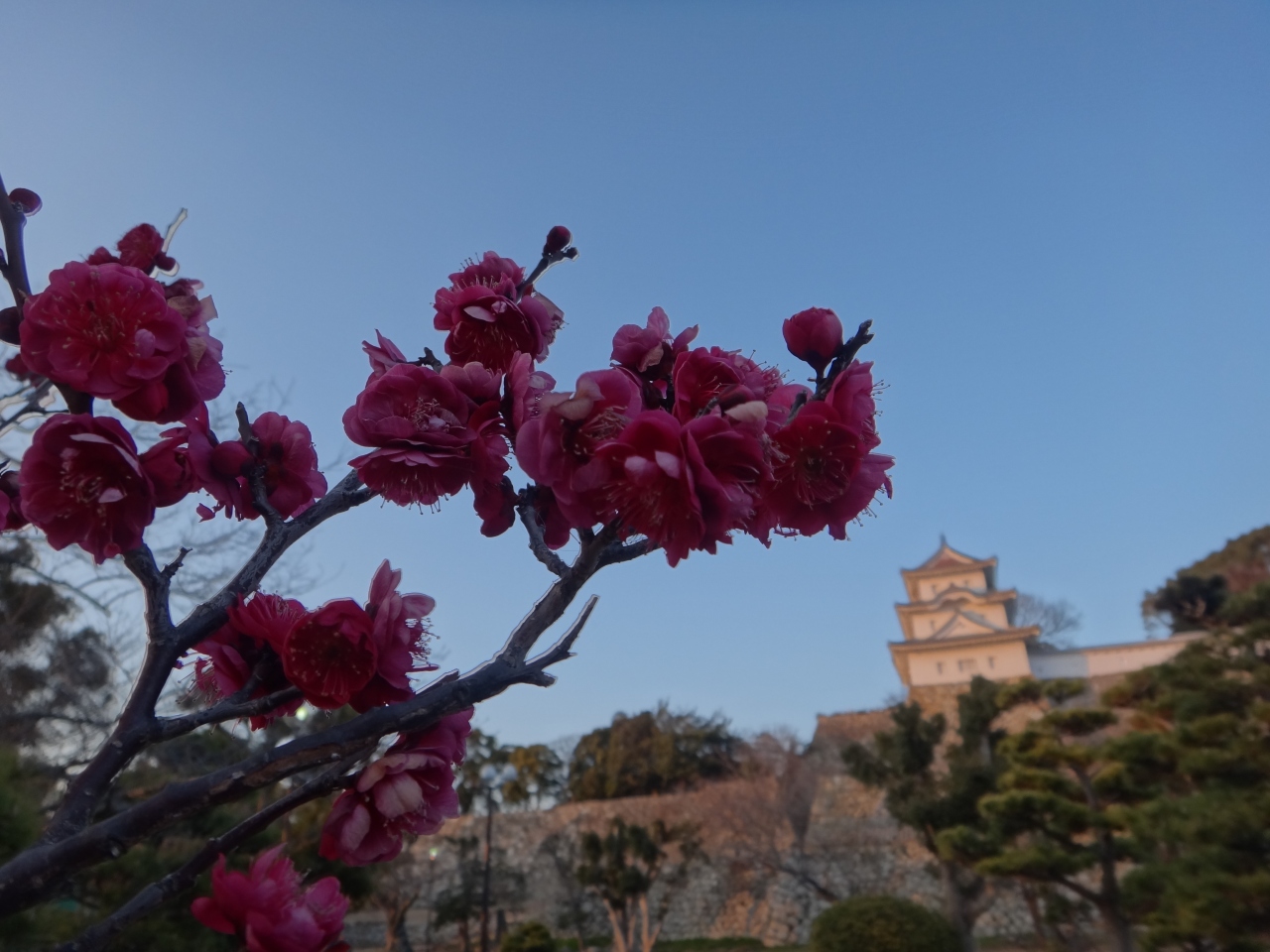 2月初旬、きれいな梅が咲いていました。ちょうど梅と明石城(櫓)が一緒に撮れる角度があったので、何枚かシャッターを切りました。明石城の見える場所にピンク・白・赤の梅が咲いていて、もう少し奥に歩くと椿が咲いていました。