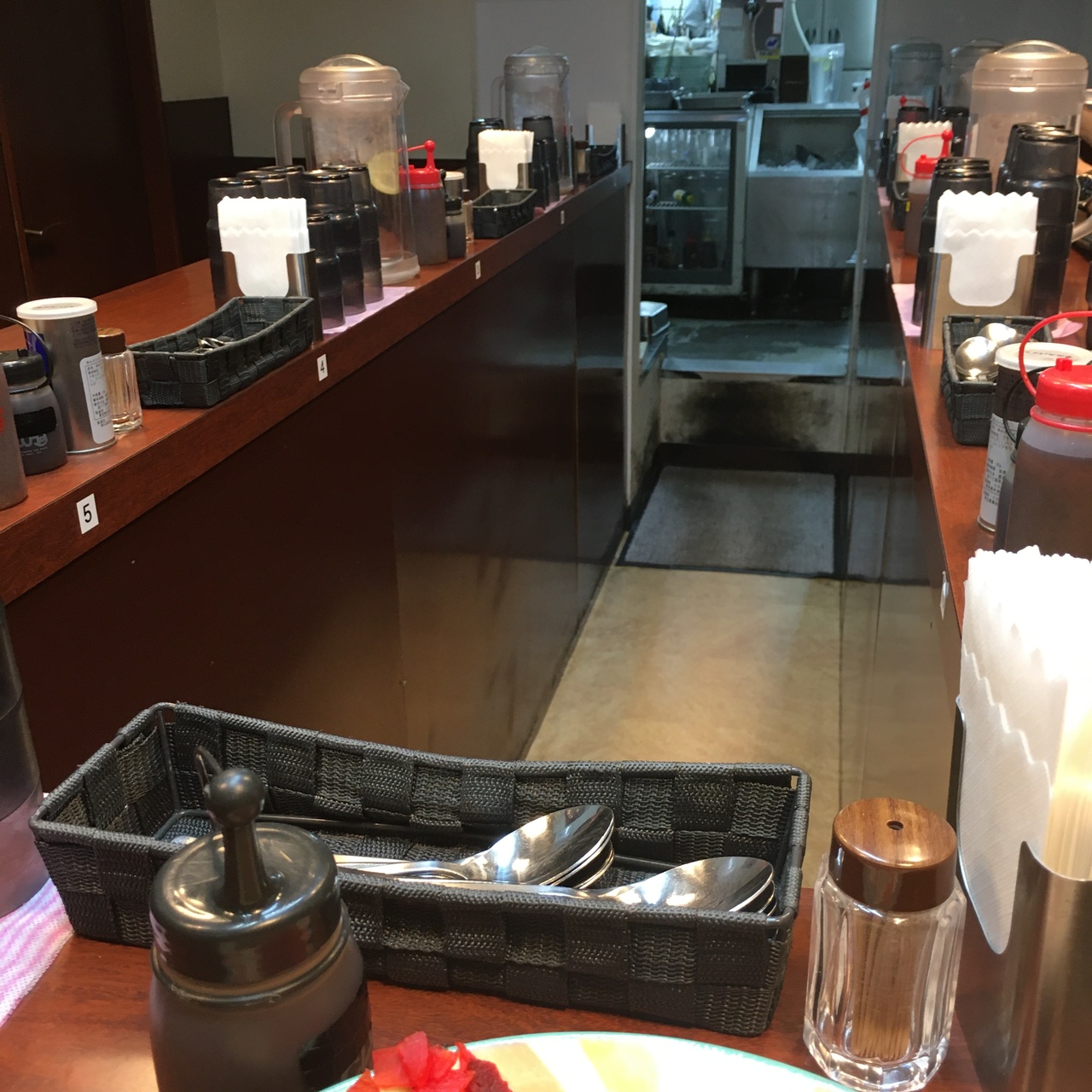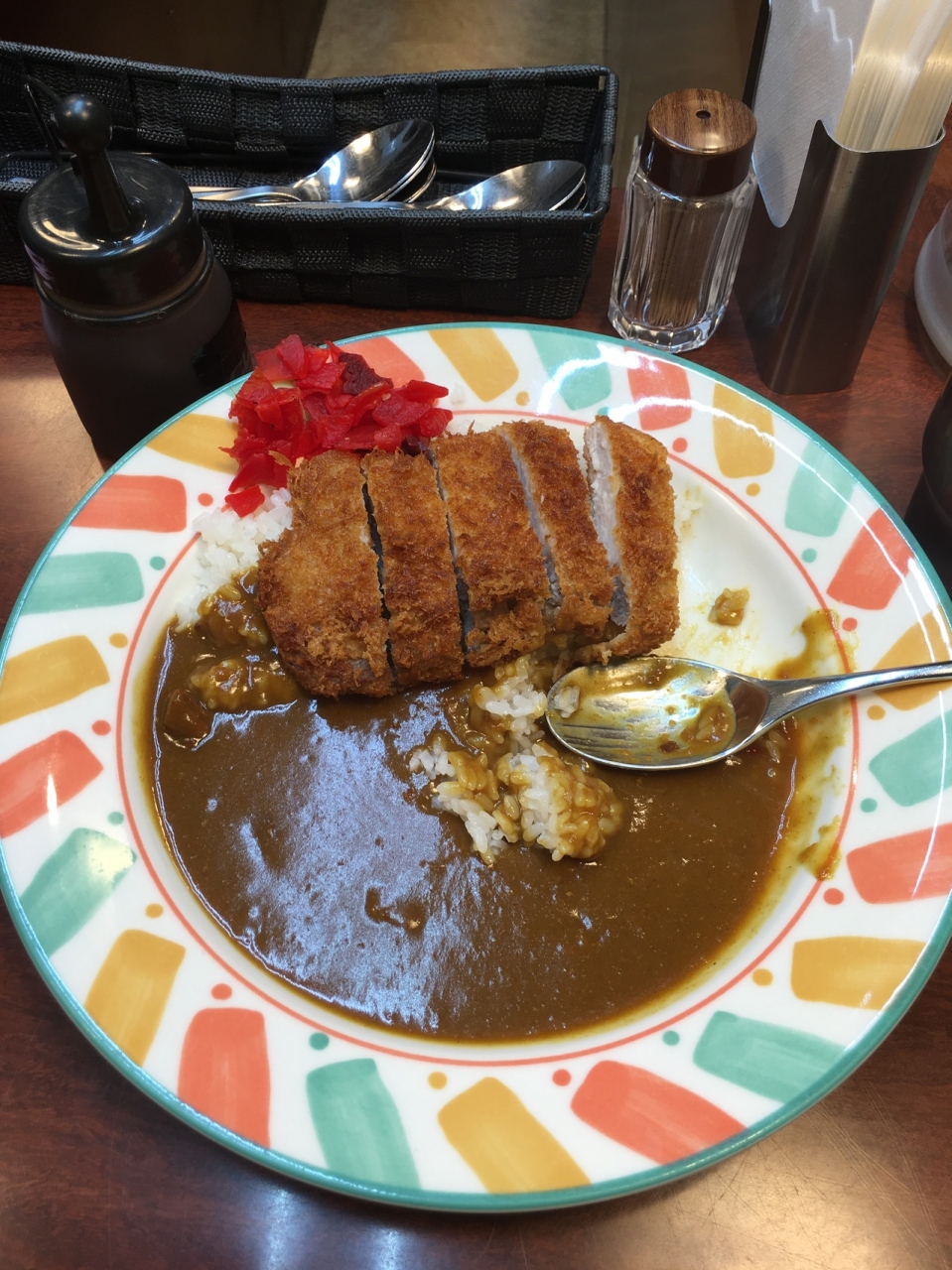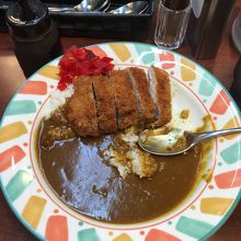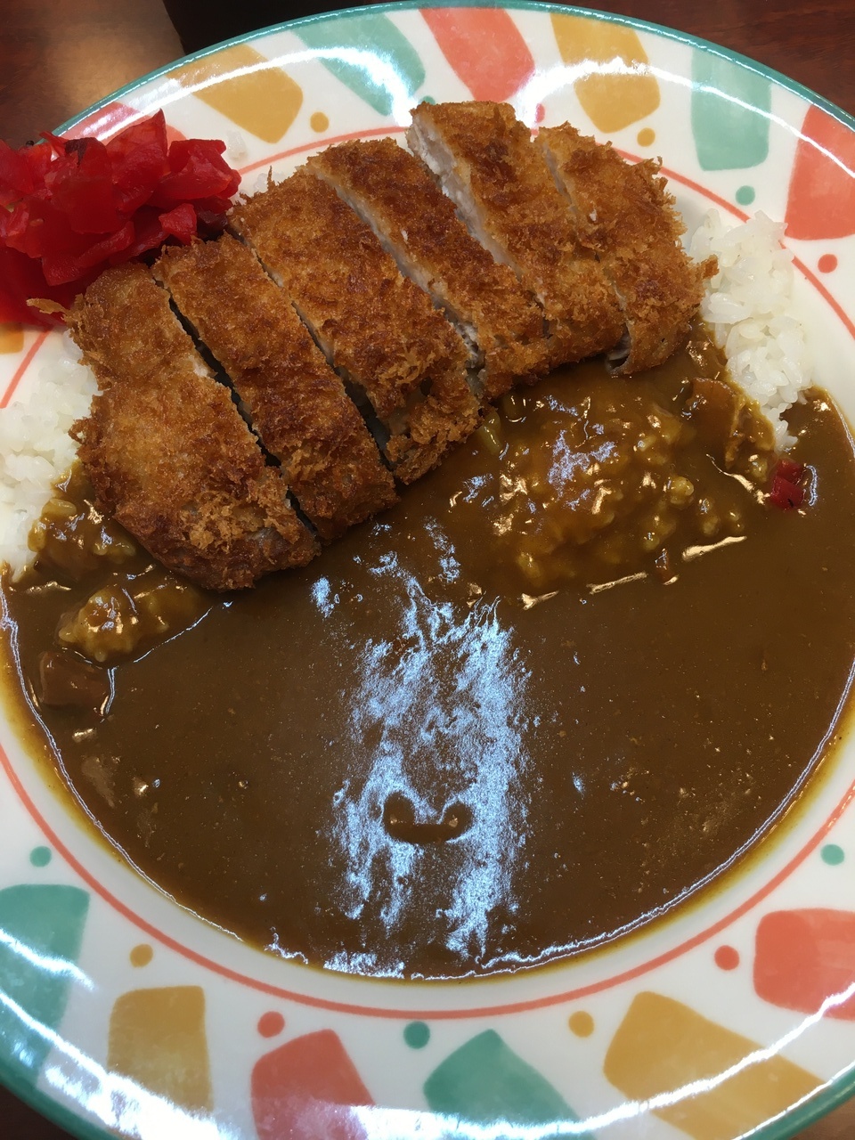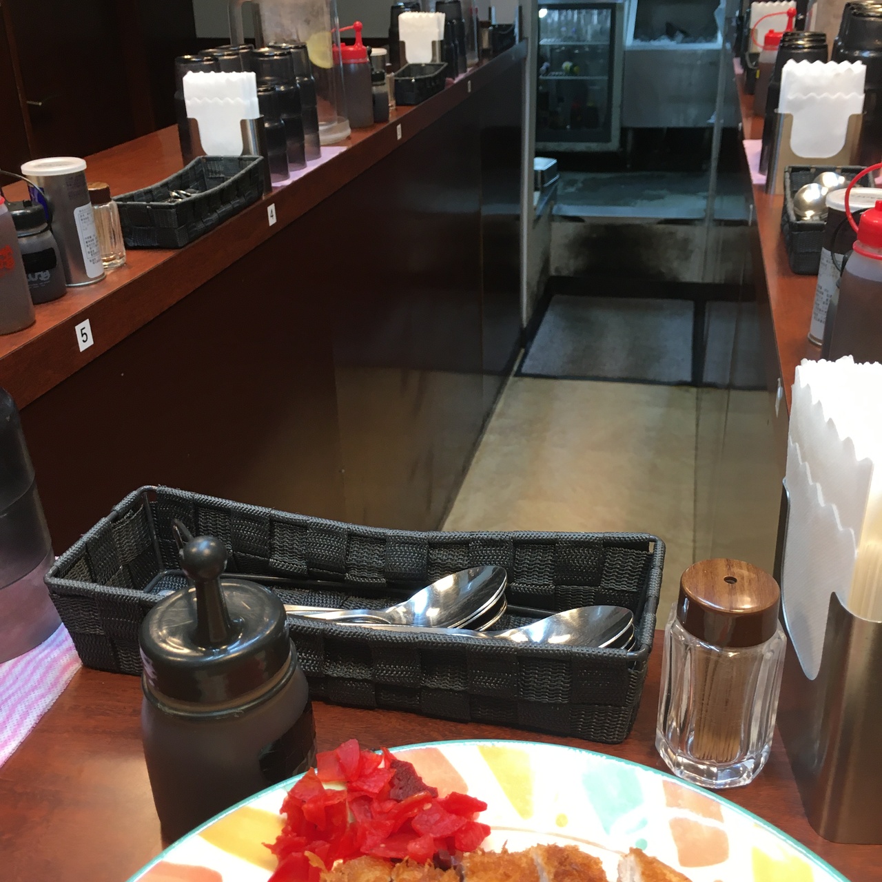ガドー下にあるのであたりは暗い雰囲気で昼にも関わらず店の看板がやたら明るかったです。コの字形のカウンター店で10人ぐらい座ることができます。厨房が座席の場所より広かったです。とんかつカレーの食券を渡したら1分もしないうちに出てきました。ドロっとした甘口のでルーで、カツが6等分に切られ、ルー等分カツの相性がよく、なかなか美味かったです。